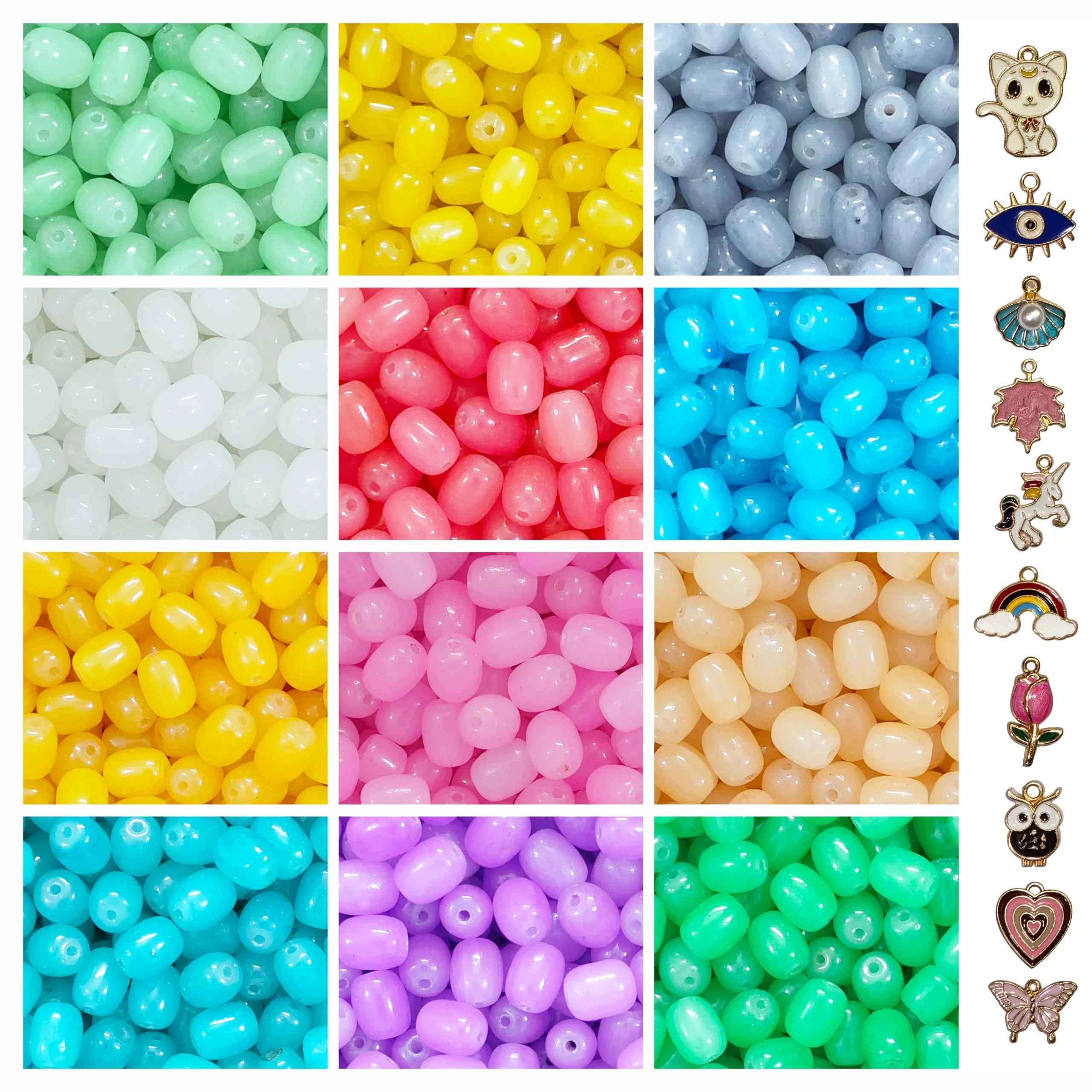 🎨 Complete Jewellery Kit – Includes 10 pcs charms + 215 pcs cylinder glass beads, 8x11mm size, in 12 assorted colours, 18 pcs each, 20g per colour, 240g total.