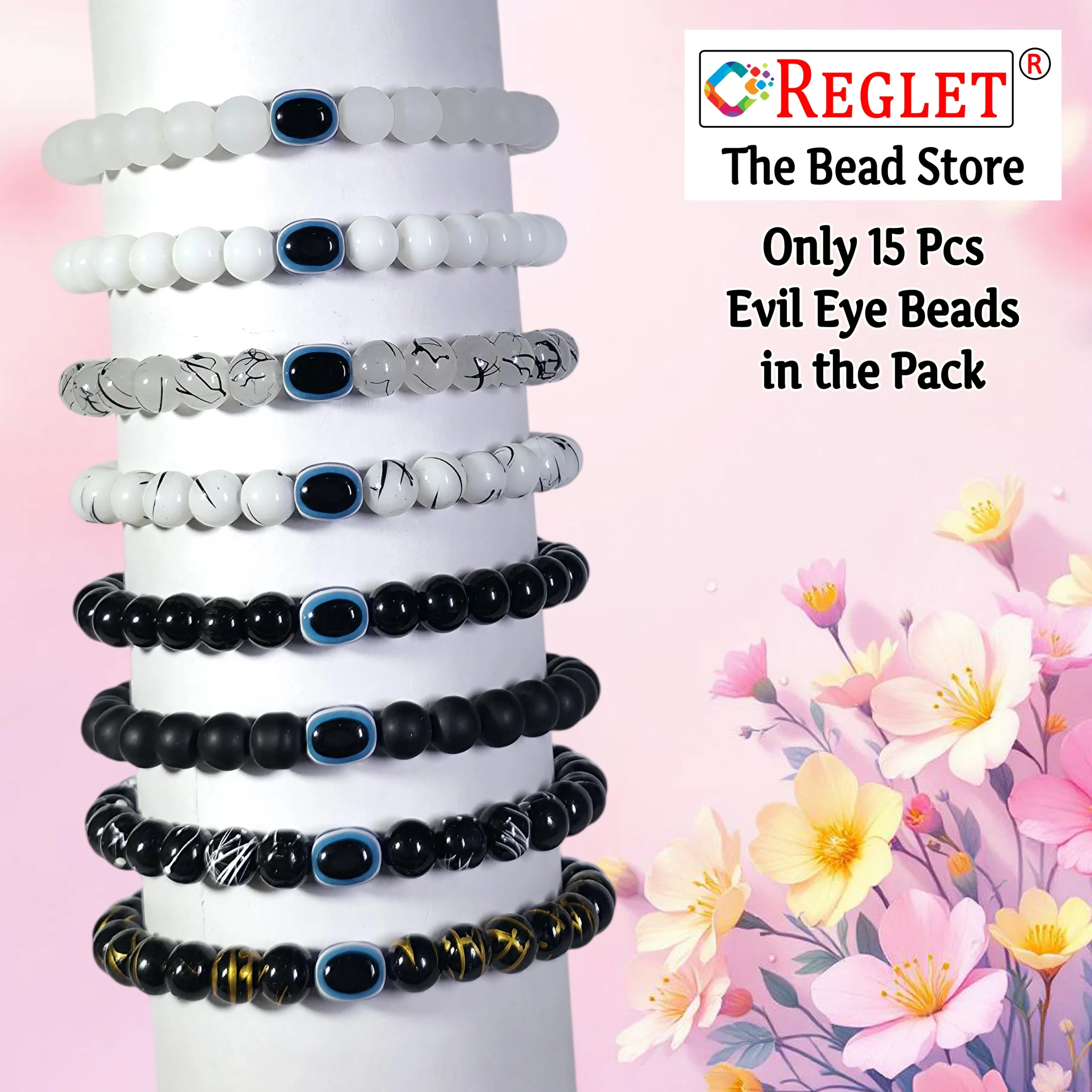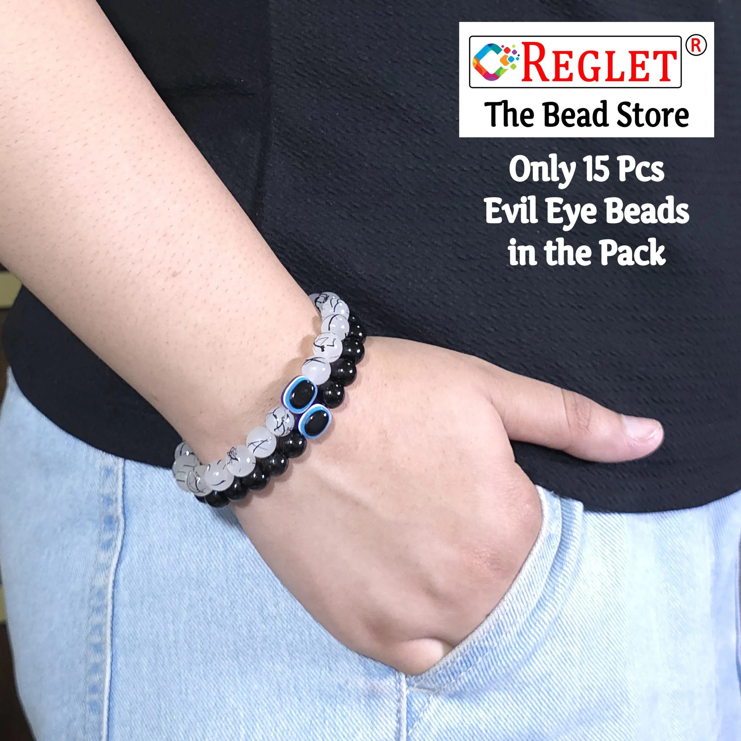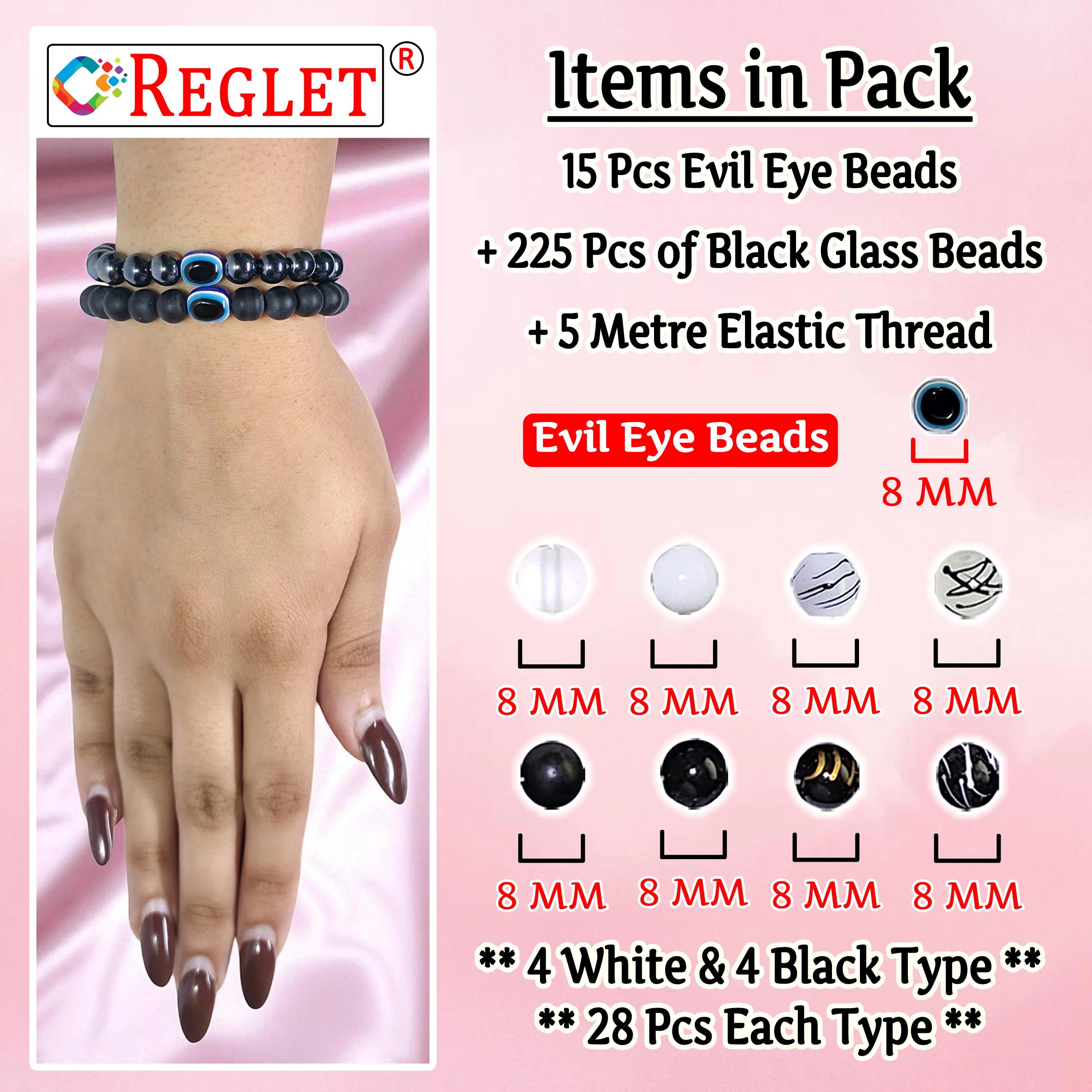 The REGLET 15 Evil Eye Beads + 225 Black & White Glass Beads Bracelet Making Kit is designed for women who love jewellery making and DIY crafts. โจ This set includes 15 symbolic Evil Eye beads along with 225 glossy 8mm beads in a chic black-and-white theme. With 8 bead types (4 white + 4 black, 20g each, 160g total), it offers endless creative possibilities. ๐จ The beads are durable, smooth, and crystal-like, making your jewellery look polished and professional. ๐ Perfect for bracelets, necklaces, earrings, and embroidery, this kit blends elegance with meaning. ๐งต Suitable for beginners and professionals alike, it makes jewellery making fun, stylish, and protective. ๐