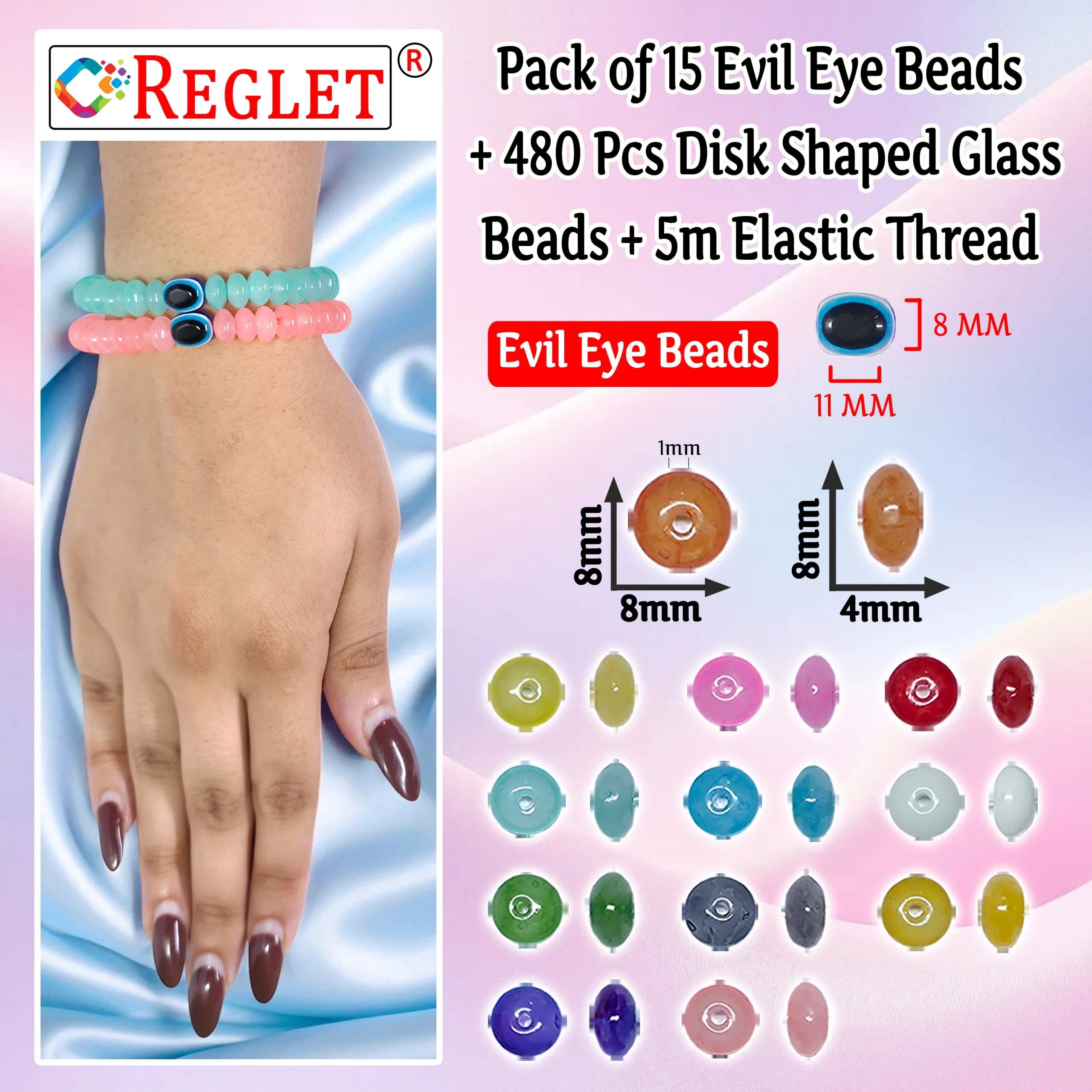 Create stunning handmade jewellery with the REGLET Bracelet Making Kit, featuring 480 premium disk-shaped glass beads (8ร4mm) in 12 vibrant colours, along with 15 Evil Eye beads and a 5m stretchable wire. Each colour pack includes 20 grams (~40 beads), totalling 240 grams, giving you ample material for multiple unique designs. The sparkling crystal glass beads are smooth, durable, and add elegance to every creation. Whether youโre making bracelets, necklaces, earrings, anklets, or embroidery projects, this kit is perfect for both beginners and experienced jewellery makers. The included Evil Eye beads bring charm and protection to your designs, while the adjustable stretch wire makes them comfortable to wear. A complete set for DIY jewellery lovers and gifting.
