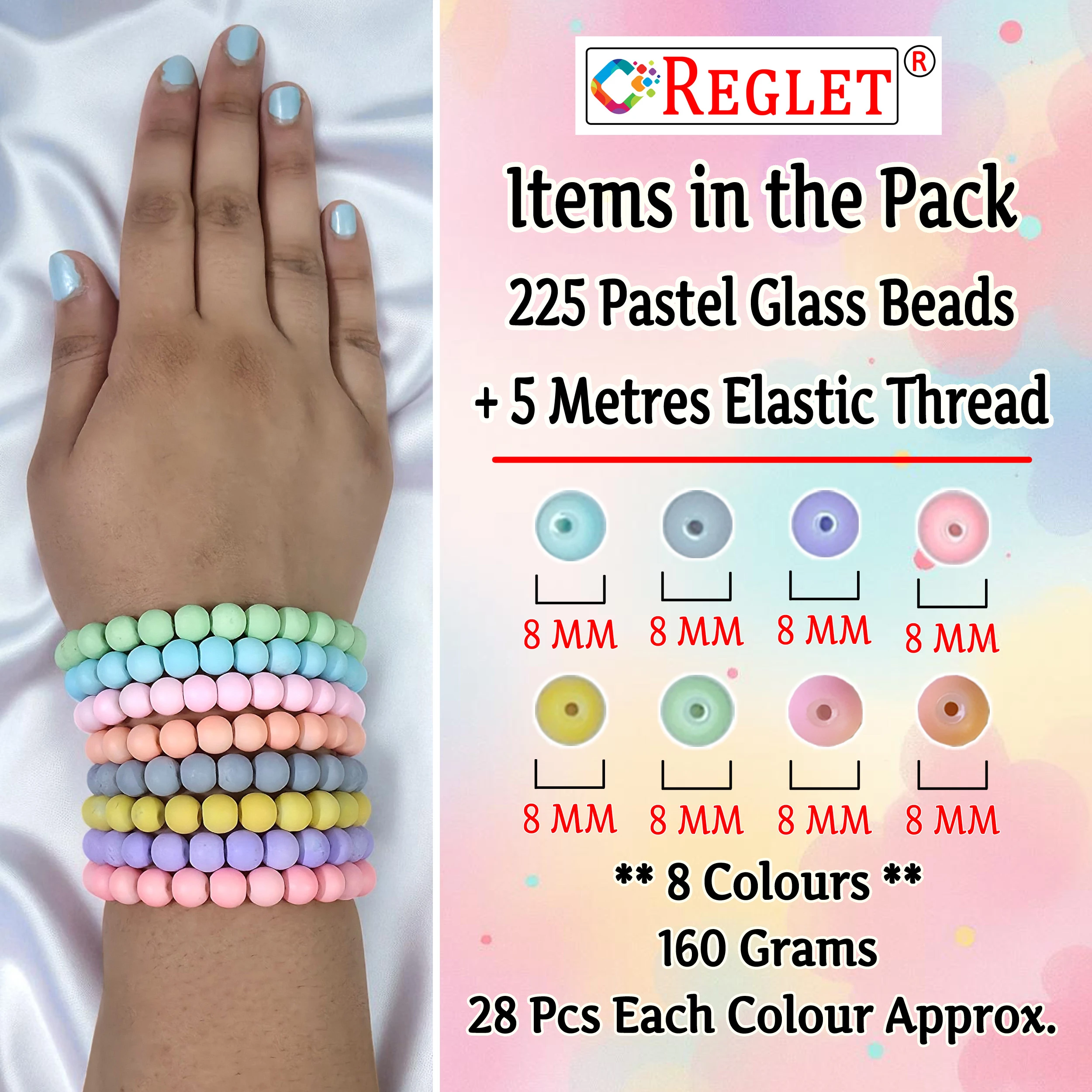 The REGLET 225 Pcs Pastel Colour Glass Beads Bracelet Making Kit is designed for jewellery lovers and DIY craft enthusiasts. The set includes 225 glass beads (8mm) in 8 pastel colours, with 20 grams per colour and a total weight of 160 grams. Each bead has a smooth, glossy finish, perfect for creating bracelets, necklaces, earrings, anklets, and keychains. A 5-metre elastic thread is included, making it easy to start crafting right away. Ideal for beginners and professionals, this kit also makes a thoughtful gift for kids and adults.