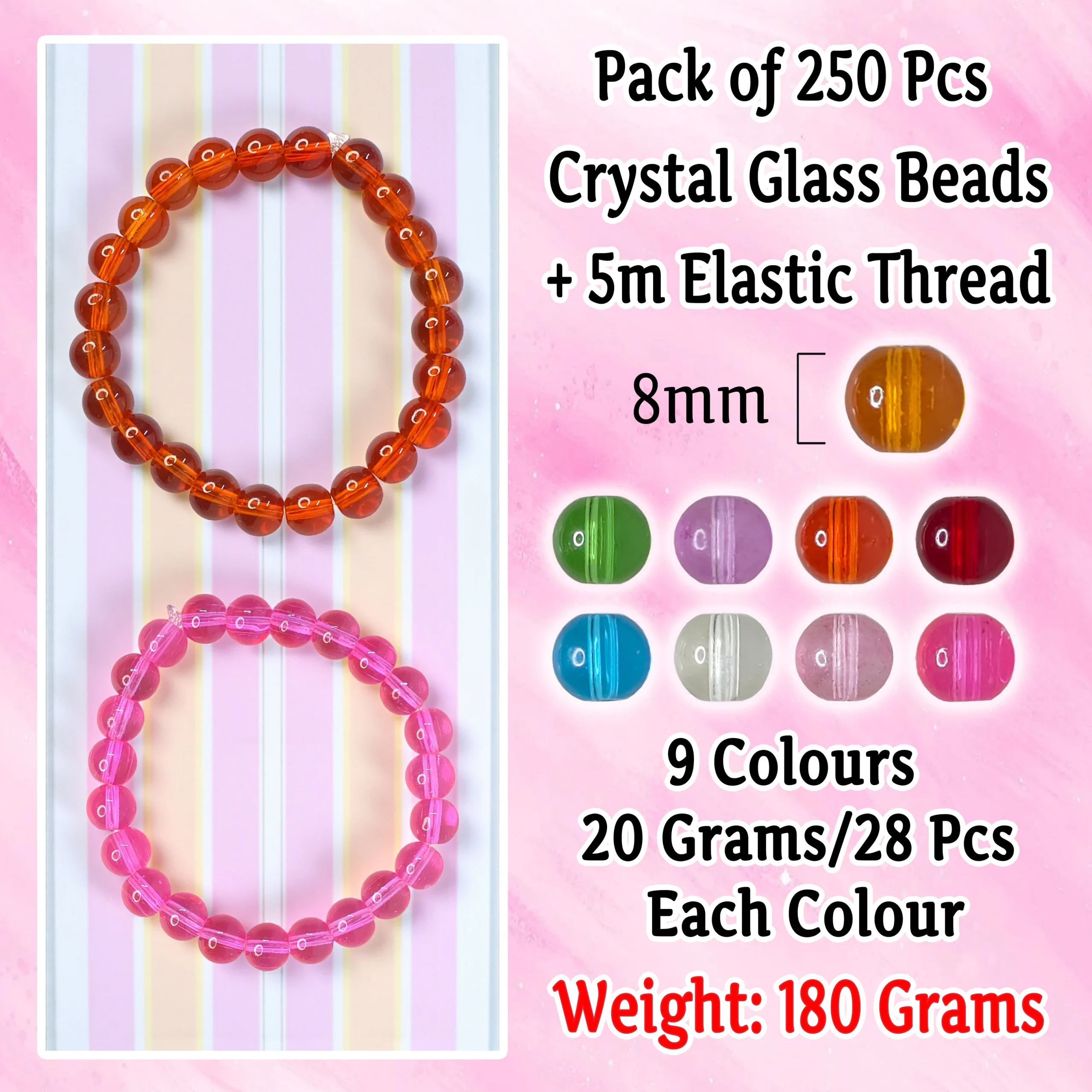 ๐ Includes 250 Premium Beads โ A complete set of 250 high-quality 8mm crystal glass beads in 9 dazzling shades (28 pcs each, 20g per colour) for creative jewellery designs.