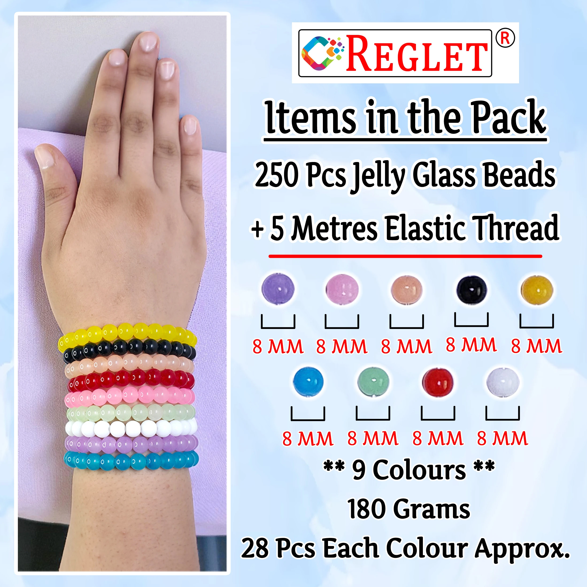 โจ COMPLETE JEWELLERY KIT โ Includes 250 pcs of premium Jelly Glass Beads in 9 different vibrant colors (20 grams each) plus 5 meters of strong elastic wire.
