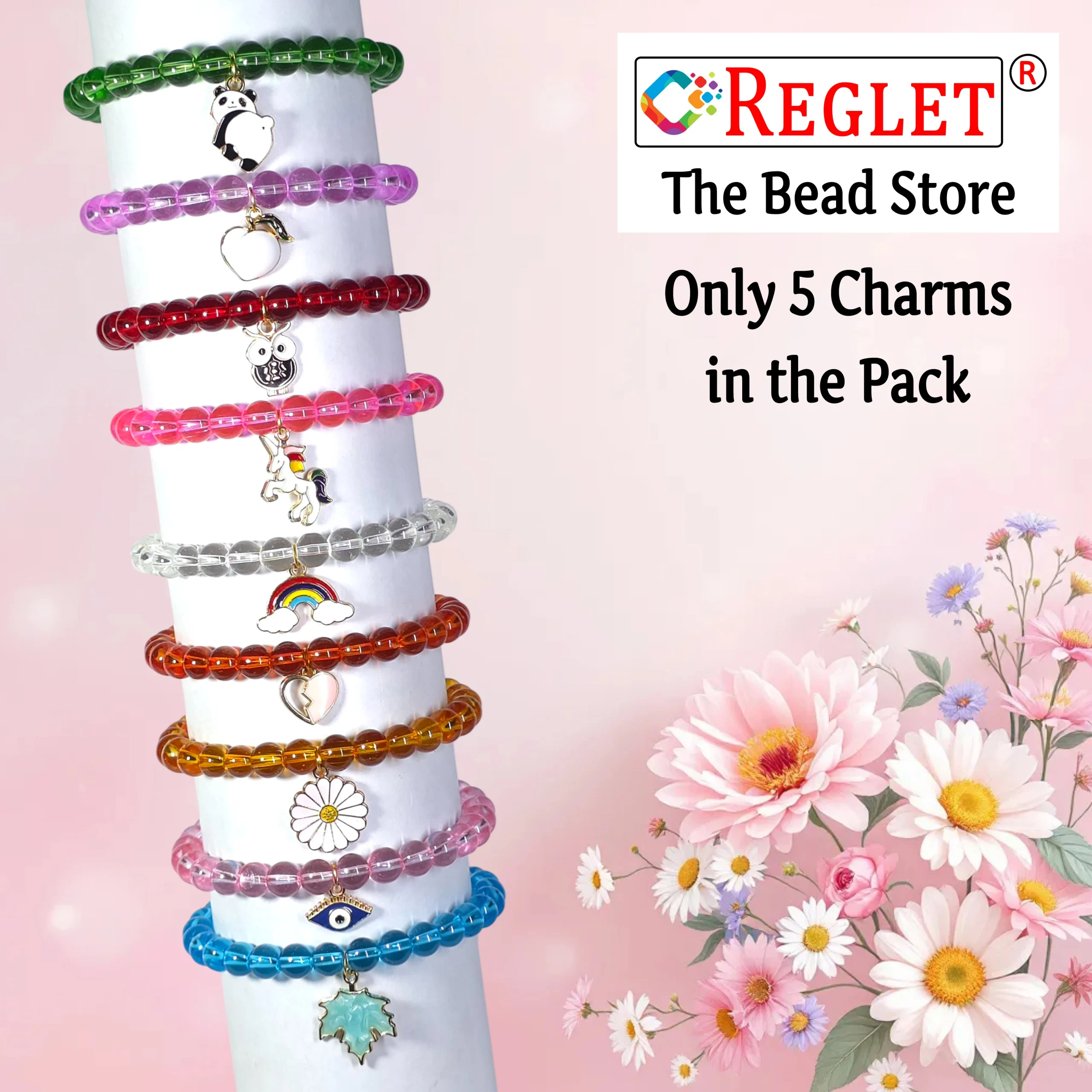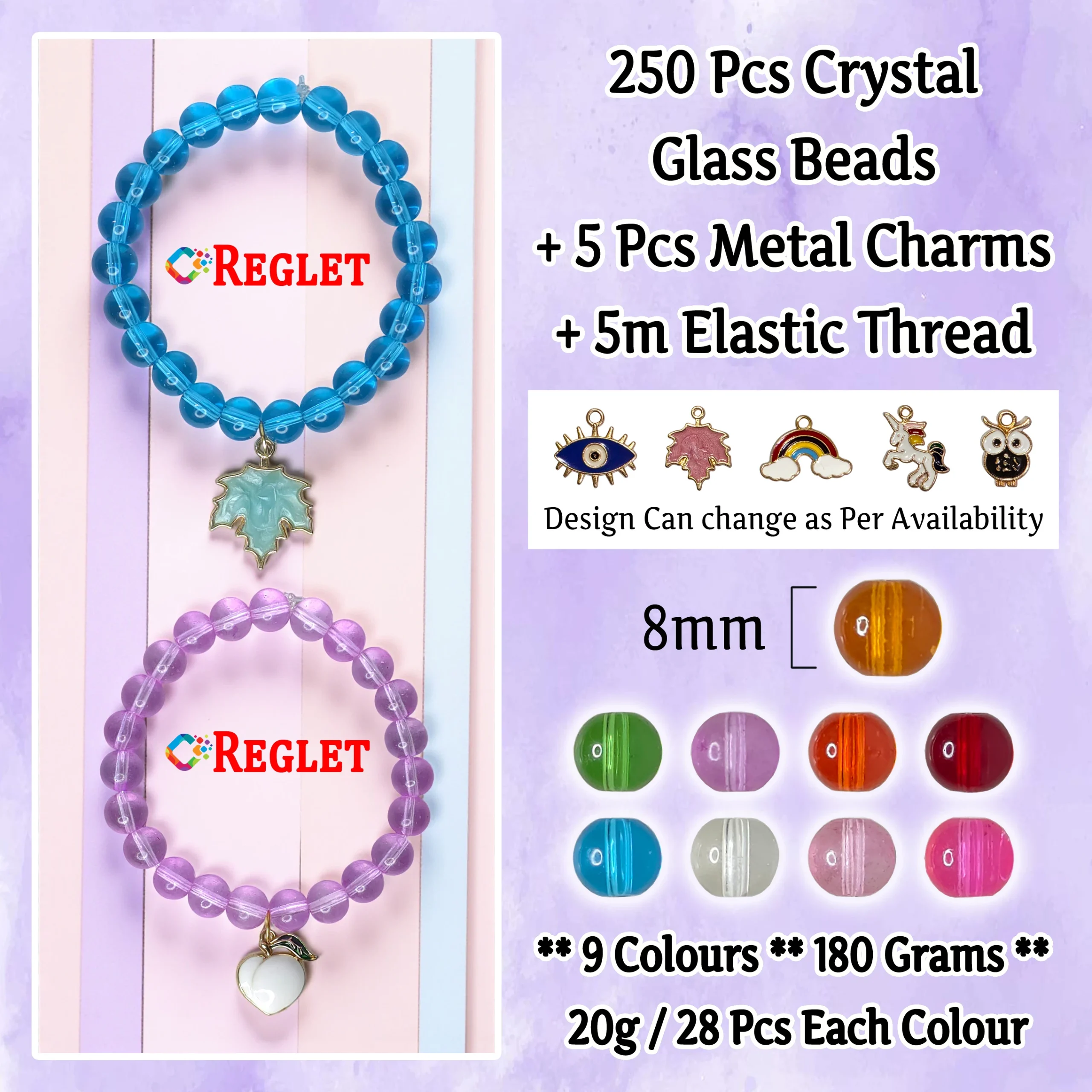 The REGLET 5 Pcs Charms + 250 Pcs Crystal Glass Beads Bracelet Making Kit is designed for women who love crafting elegant and colourful jewellery. It includes 250 premium 8mm crystal glass beads in 9 vibrant shades, each weighing 20 grams with approximately 28 beads per colour. The addition of 5 stylish metal charms allows you to personalize your creations. A 5-metre stretchable elastic thread makes the process simple and comfortable. Each bead has a brilliant crystal-like shine, smooth finish, and perfect shape, ideal for making bracelets, necklaces, earrings, and decorative crafts. Whether youโre a beginner or an expert, this all-in-one kit is perfect for DIY jewellery, gifting, or creative projects.
