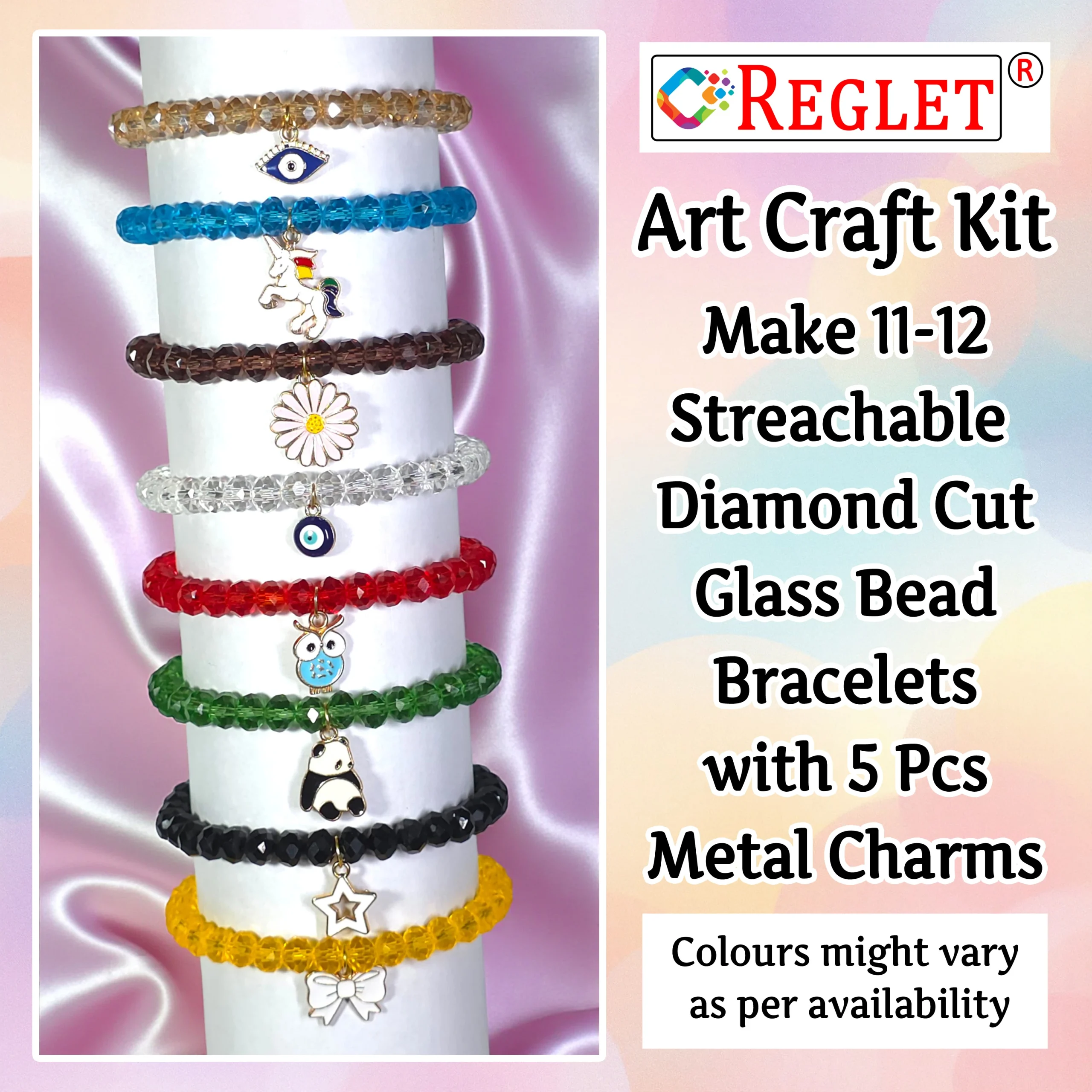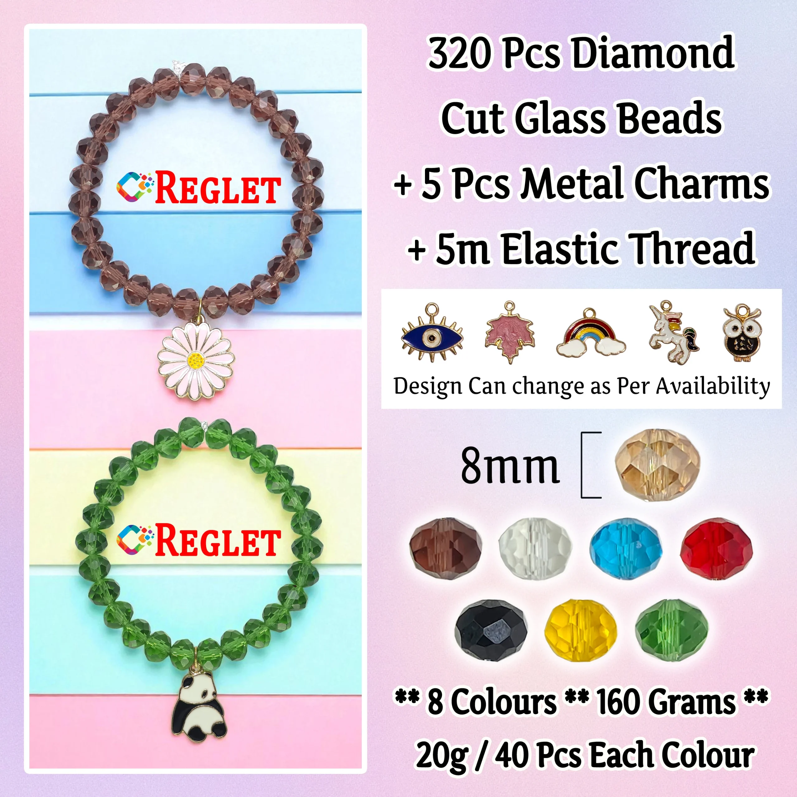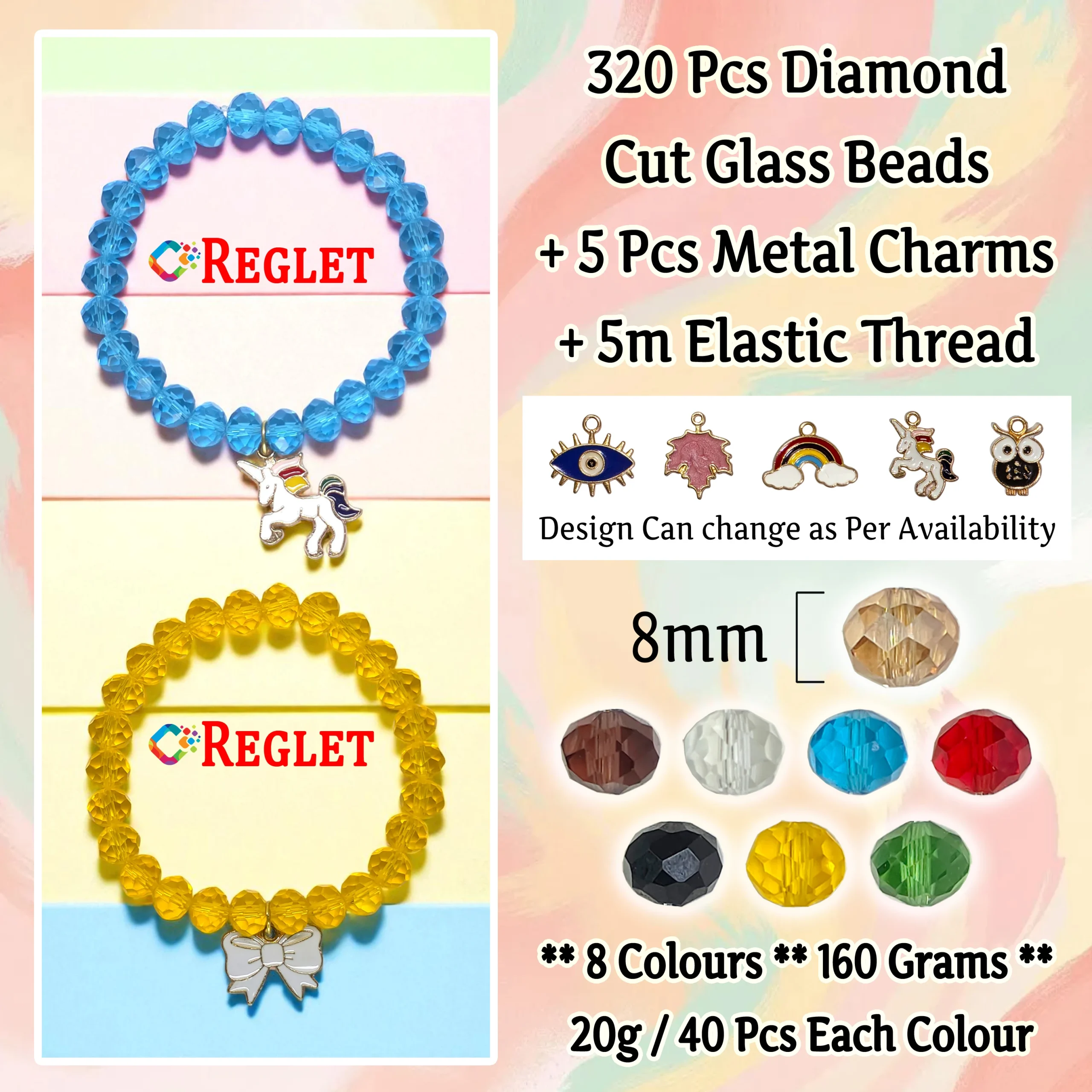 The REGLET 5 Pcs Charms + 320 Pcs Diamond Cut Glass Beads Kit is designed for creative jewellery makers and hobbyists. It features 320 brilliant 8mm glass beads in 8 stunning colours (40 pieces each) and 5 decorative charms for added beauty. Each diamond-cut bead shines with elegance, perfect for bracelet making, beading, embroidery, and bead craft. The 5-metre elastic thread ensures strength, flexibility, and comfort in every creation. Whether for personal use or gifting, this Beads for Jewellery Making Kit is ideal for crafting stylish accessories, enhancing beadwork skills, and expressing creativity through handmade designs.