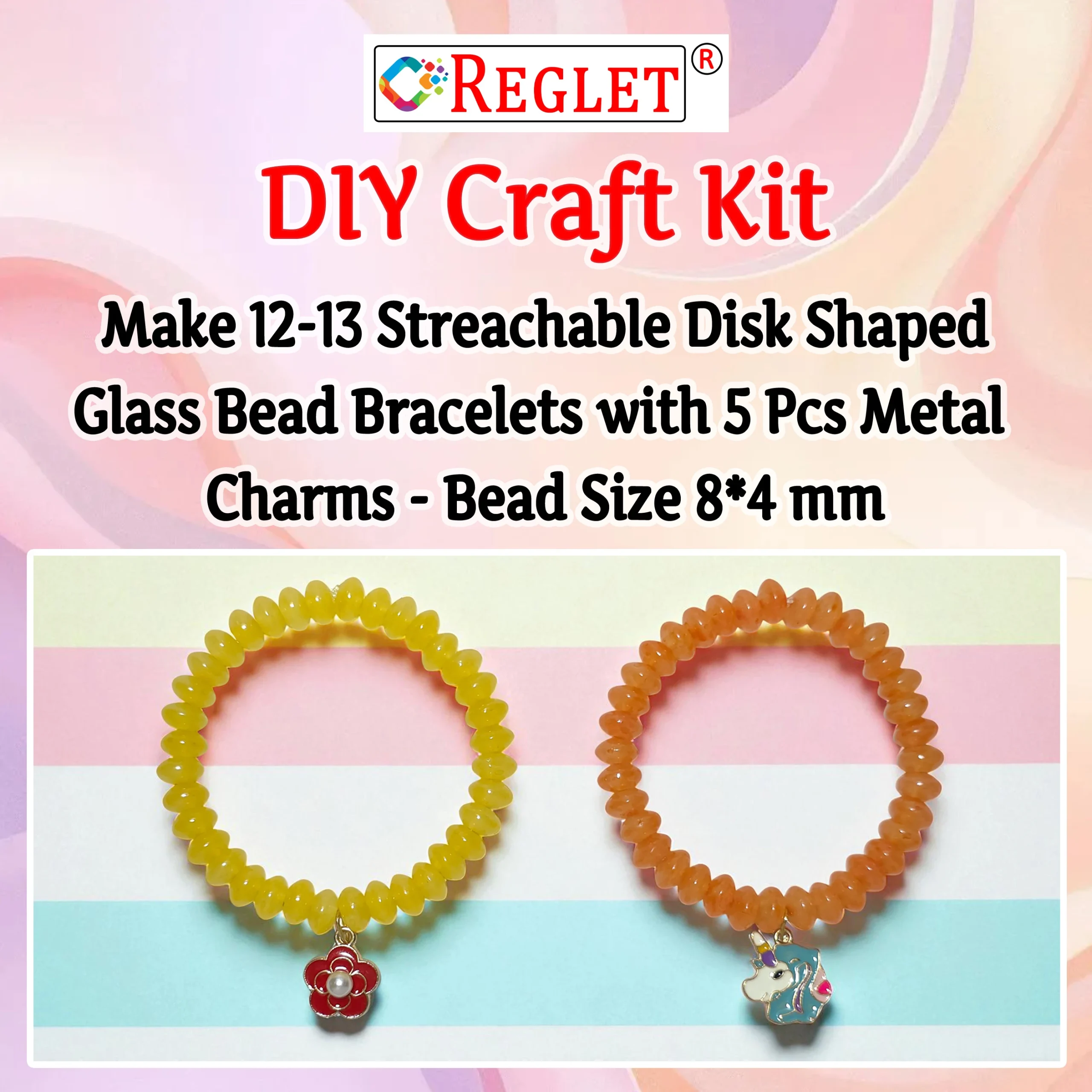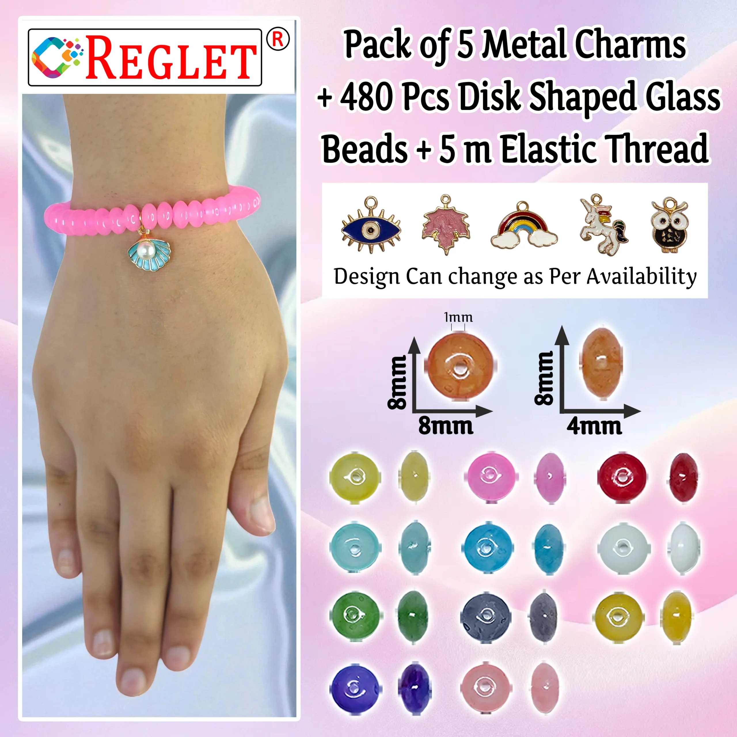 The REGLET 5 Pcs Charms + 480 Pcs Disk Shaped Glass Beads Bracelet Making Kit is a complete jewellery-making solution for women and girls who love creativity and style. This kit includes 480 premium 8x4mm glass beads in a unique disk shape, available in 12 elegant colours (20g each, approx. 40 pcs per colour), offering a wide range of design possibilities. The set also comes with 5 stylish charms to add a personalised and fashionable touch to your jewellery. Each bead is smooth, durable, and crystal-like, ensuring your handmade accessories look elegant and professional. With 5m of stretchable wire included, you can easily create bracelets, necklaces, earrings, or repair existing pieces. Ideal for crafting, beadwork, embroidery, or gifting, this kit is perfect for both beginners and professionals.