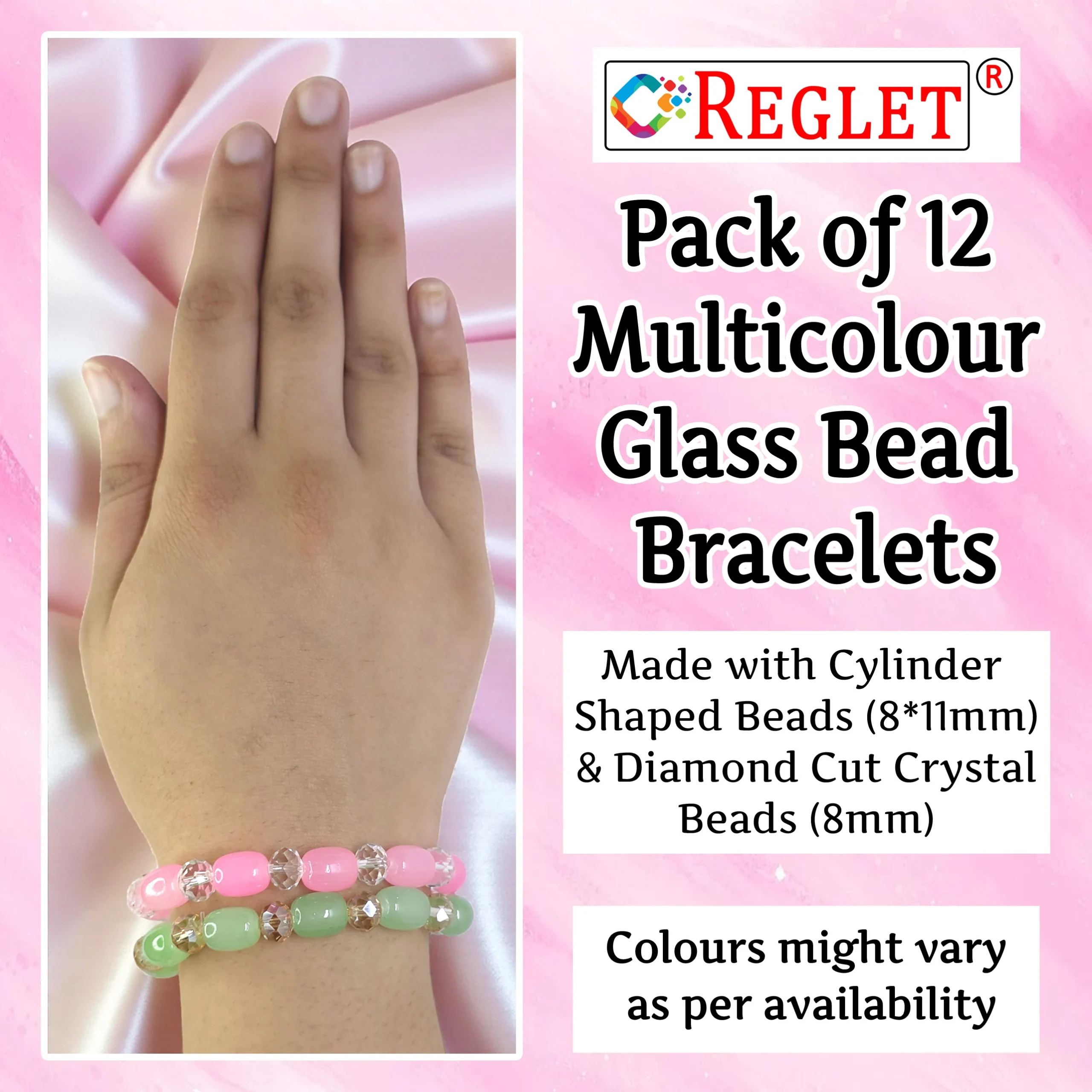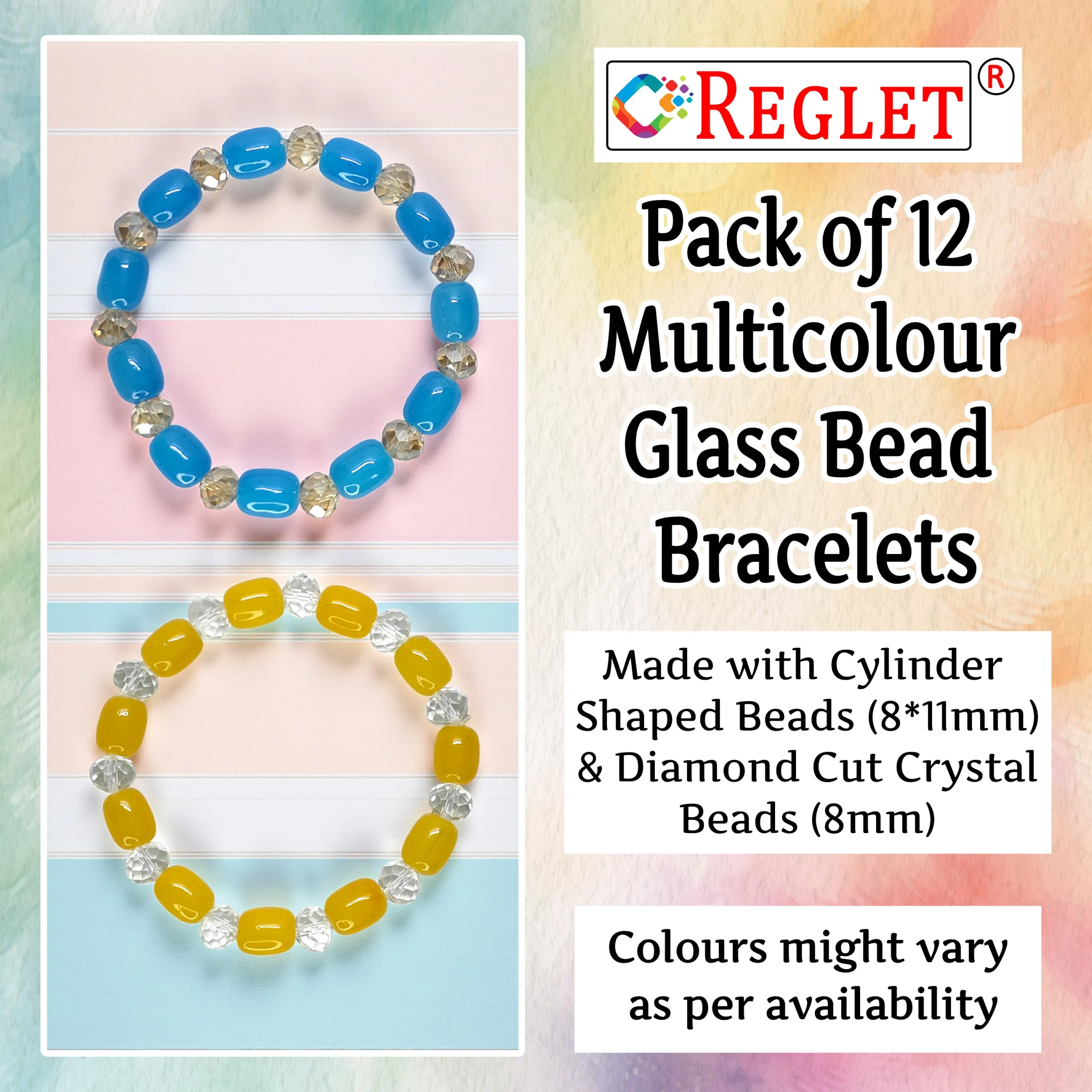 Enhance your jewelry collection with the REGLET Pack of 12 Glass Bead Bracelets with Cylinder & Diamond Cut Beads. Featuring vibrant multicolour beads in 8x11mm cylinder and 8mm diamond cut designs, these stretchable and adjustable bracelets provide a comfortable fit for women and girls of all ages. Wear them individually for a subtle sparkle or stack them together for a trendy layered look. Perfect for casual outings, parties, school, or gifting, these bracelets suit every occasion. The set includes 5 metres of elastic thread, allowing you to create personalized bracelets or enjoy your own bead craft projects. Stylish, versatile, and elegant, this bracelet set combines fashion, creativity, and practicality in one complete package.