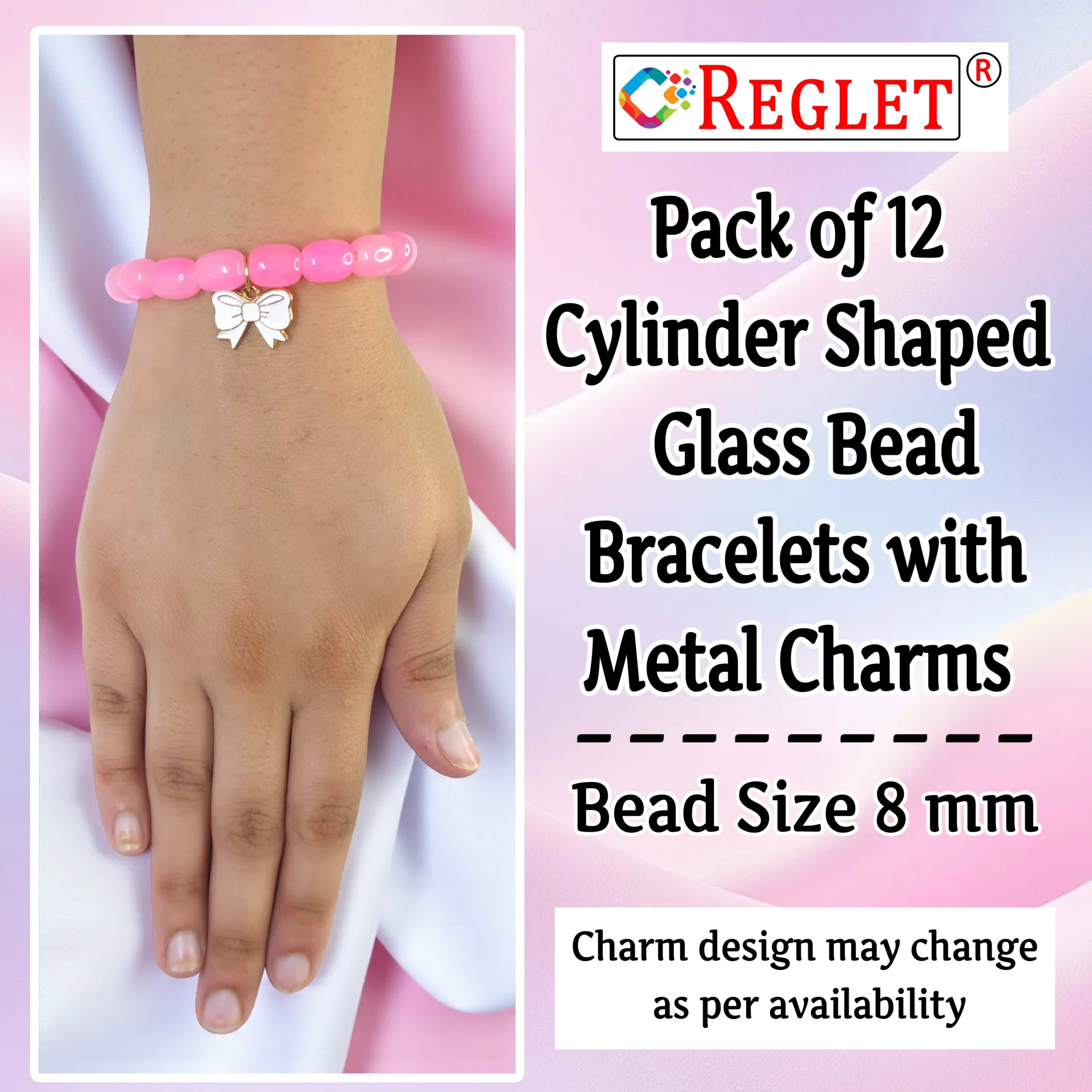 Cylinder Shaped Glass Beads Bracelet Set with Charms – Pack of 12 – Stretchable