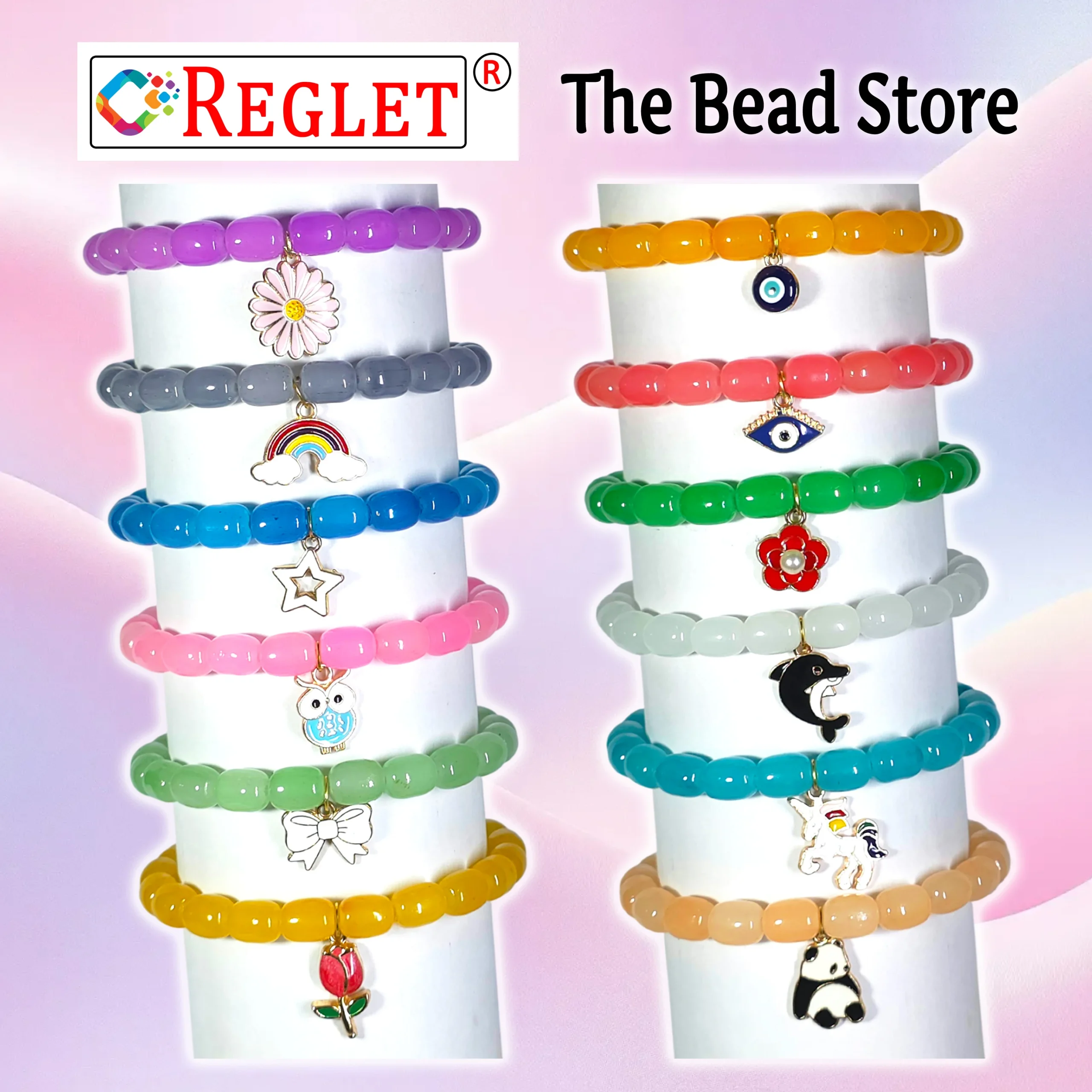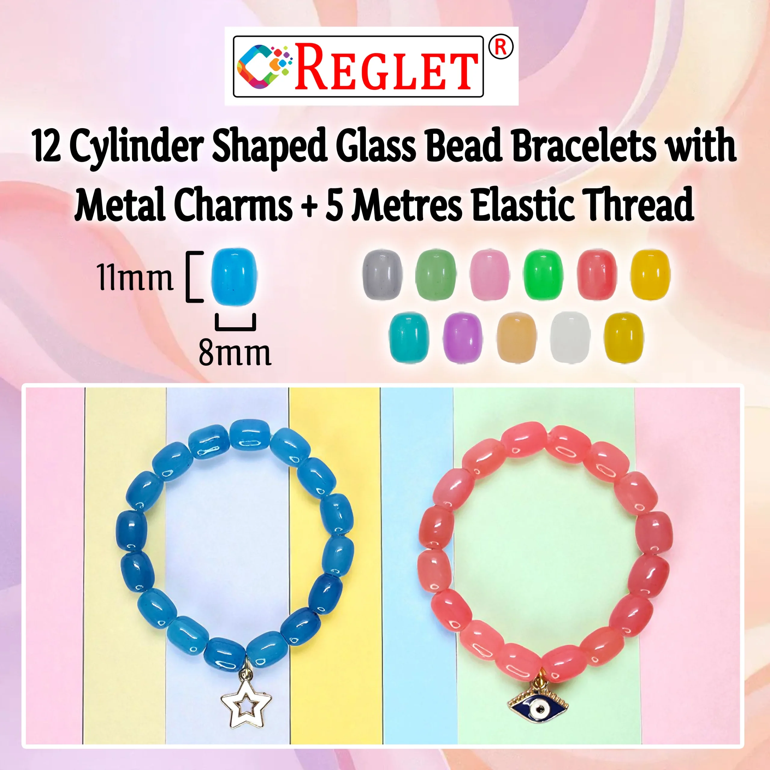 Enhance your jewelry collection with the REGLET Pack of 12 Cylinder Shaped Glass Bead Bracelets with Charms. Featuring vibrant multicolour 8x11mm cylinder beads with charming pendants, these stretchable and adjustable bracelets fit comfortably on wrists of all sizes. Wear them individually for a subtle, stylish touch or stack them together for a trendy layered look. Perfect for casual outings, parties, or gifting, these bracelets suit every occasion. The set includes 5 metres of elastic thread, allowing you to create personalized bracelets or explore your own bead craft projects. Stylish, versatile, and fun, this bracelet set combines fashion and creativity, making it a must-have accessory for women and girls.
