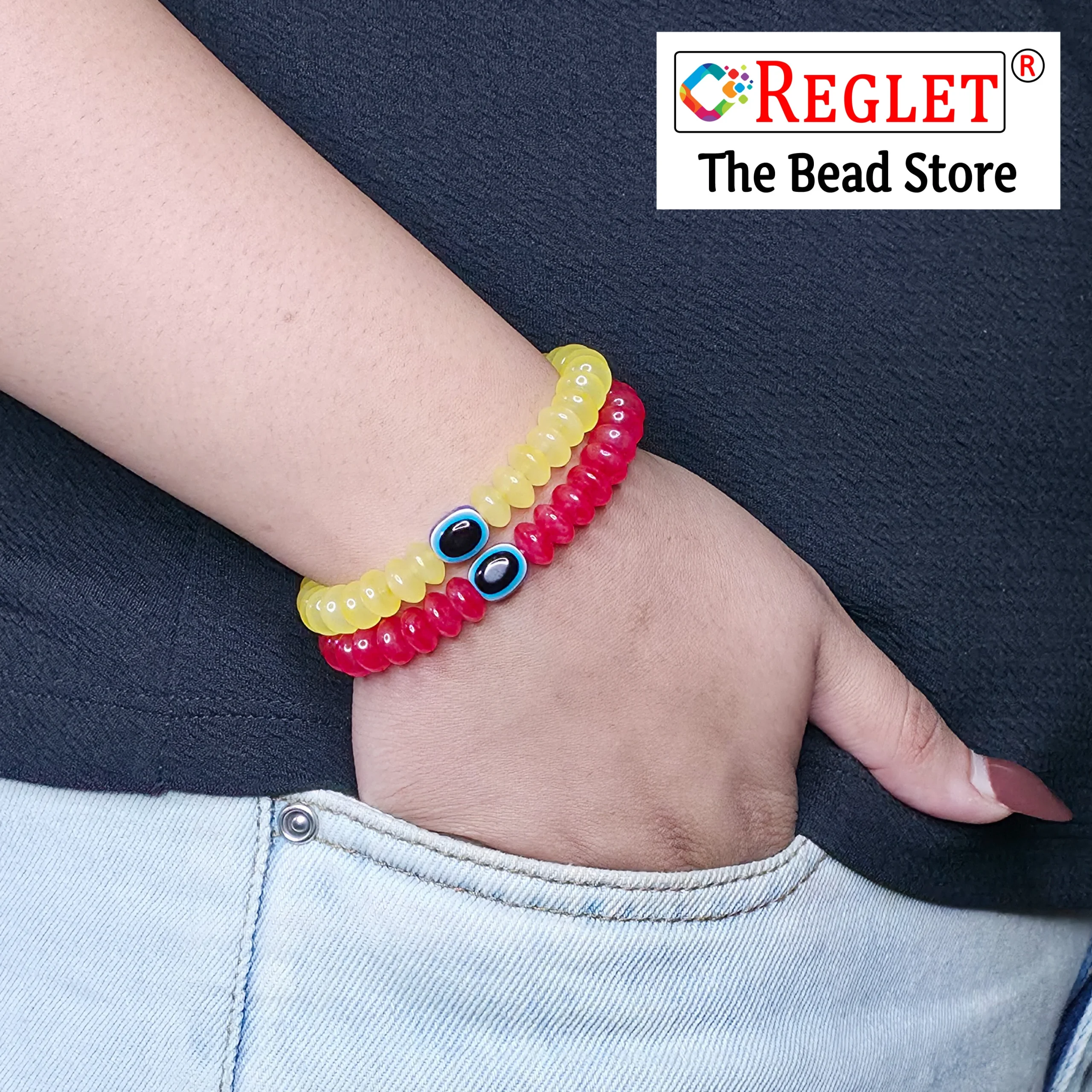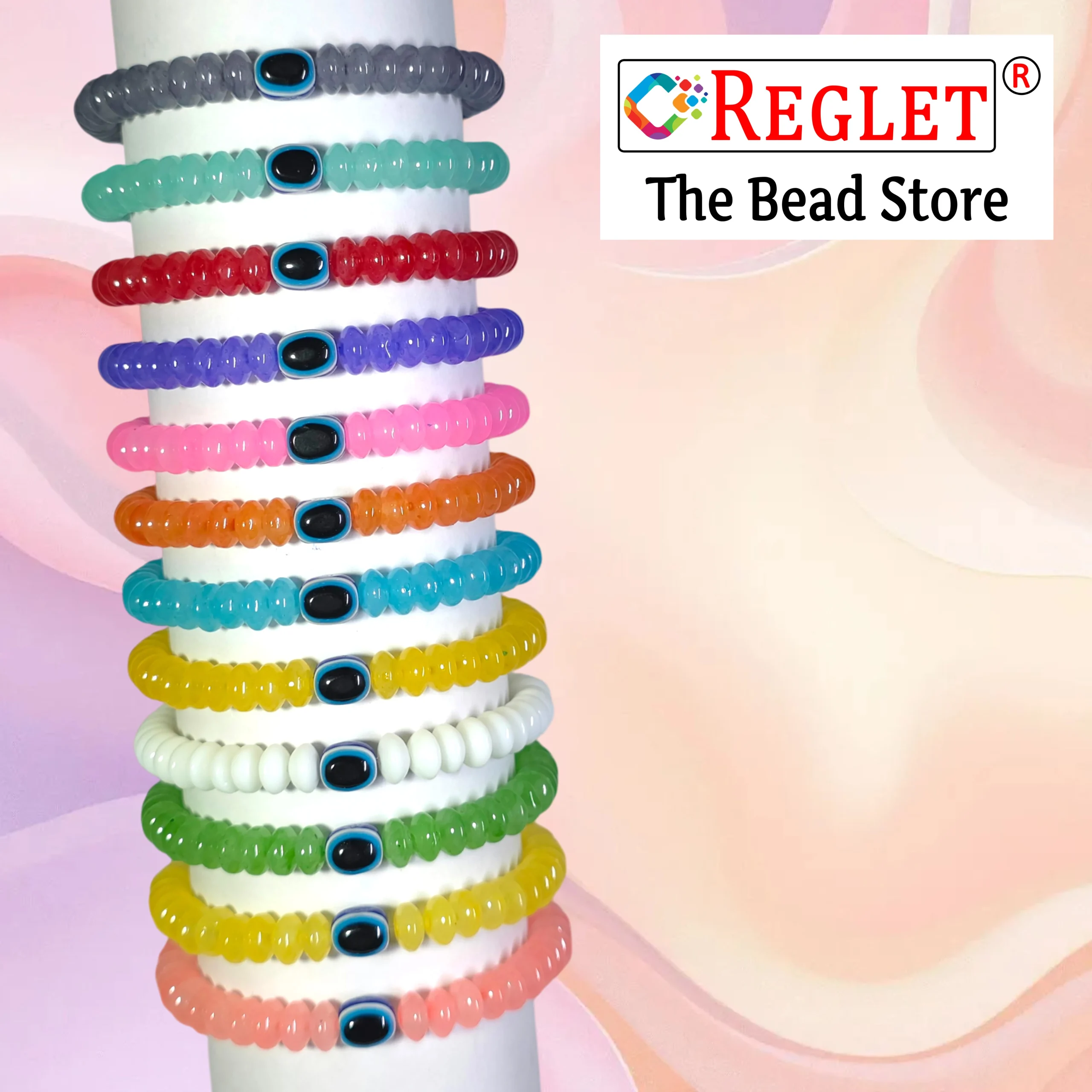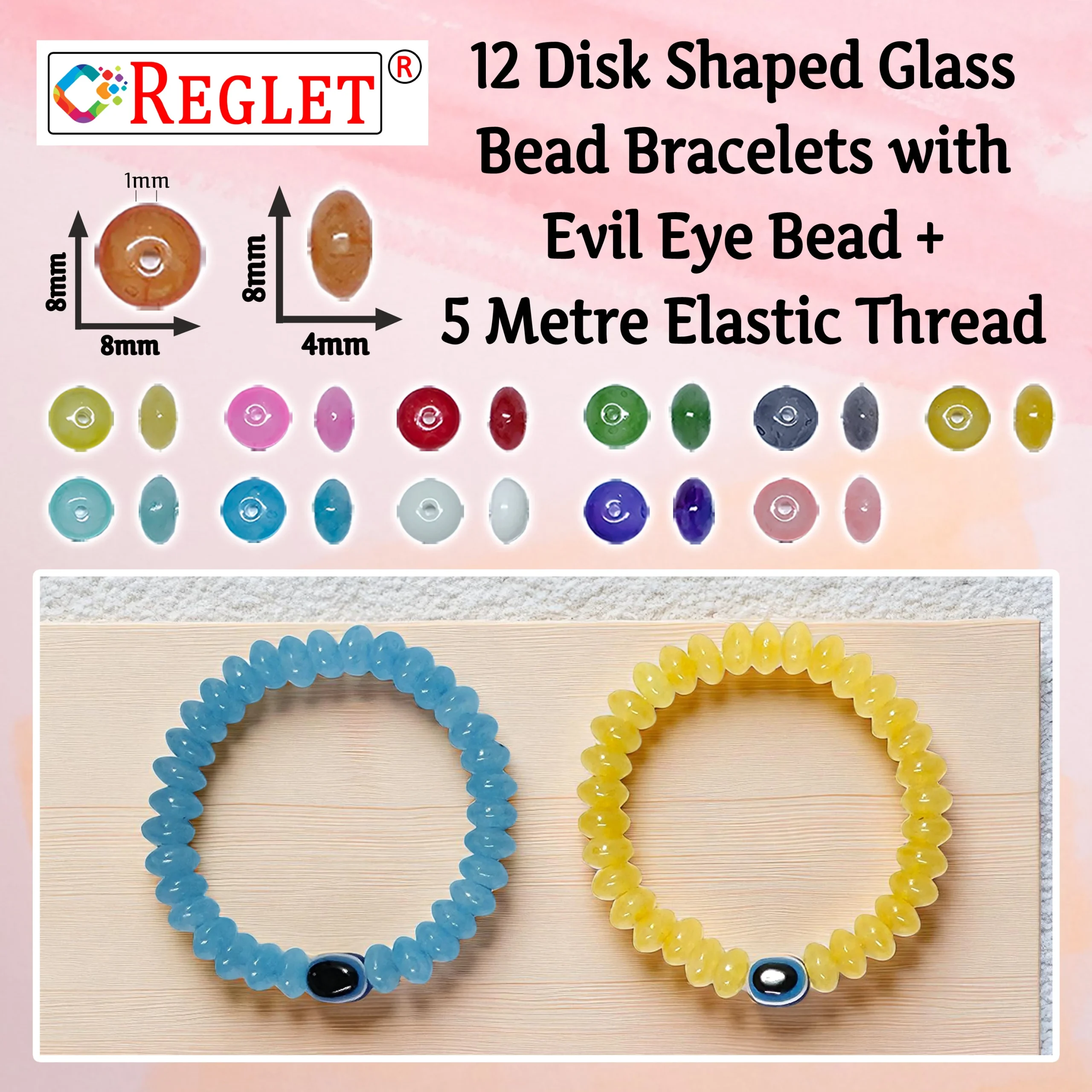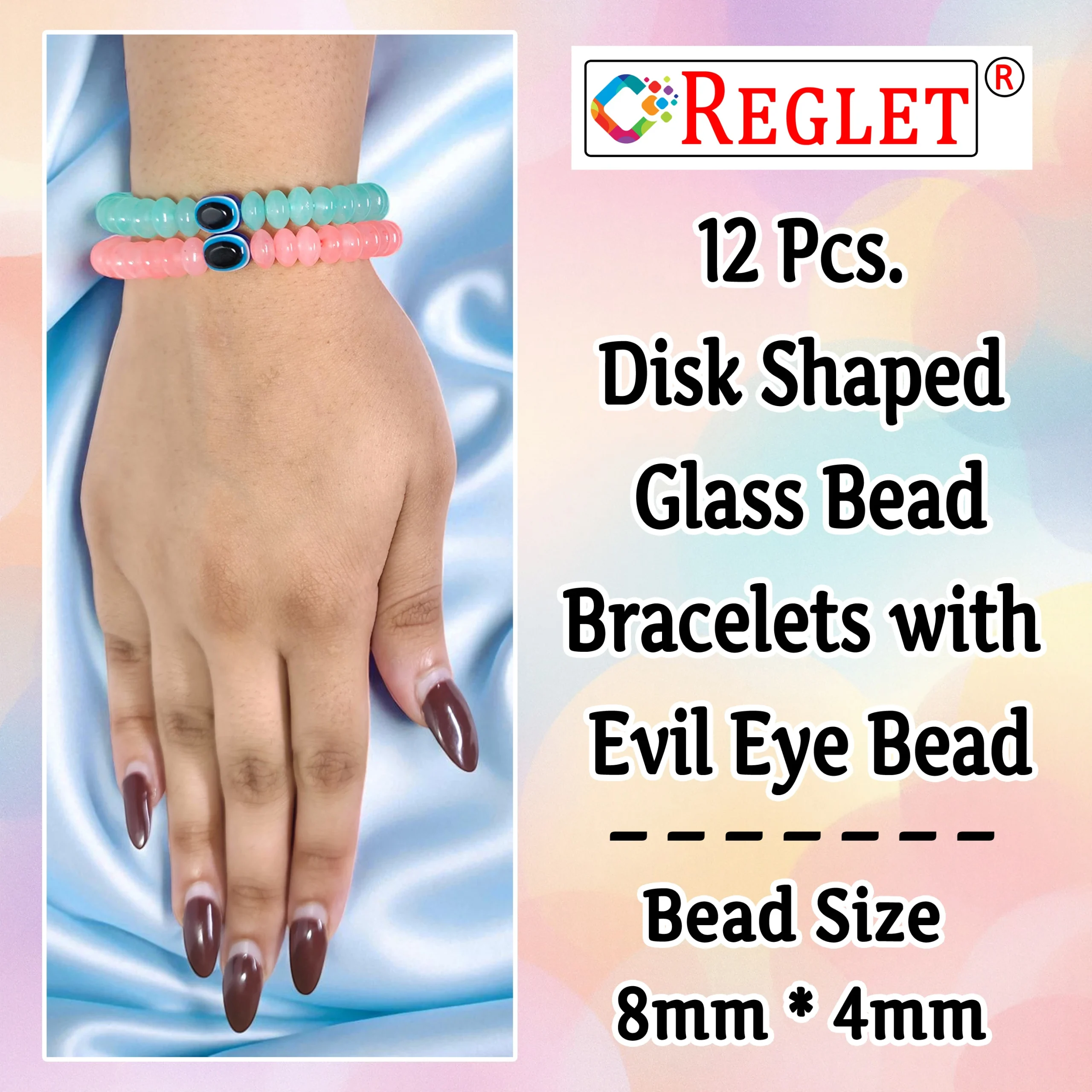 The REGLET Pack of 12 Disk Shaped Glass Bead Bracelets with Evil Eye Bead is a stylish and meaningful jewellery set for women and girls. โœจ Each bracelet is designed with premium 8x4mm disk-shaped glass beads, offering a chic and modern twist compared to regular round-bead styles. ๐ŸŽจ To enhance their charm, every bracelet is accented with an Evil Eye bead, a timeless symbol of protection and positivity, believed to keep away negativity while adding a fashionable touch. ๐Ÿ’Ž The bracelets are stretchable and adjustable, made with durable elastic wire that ensures a comfortable fit for most wrist sizes. ๐Ÿงต To make this set even more versatile, it includes 5 metres of strong stretch wire, perfect for customisation, repairs, or designing new bracelets. ๐ŸŒŸ Whether for daily wear, festive occasions, or gifting, this set is a must-have for jewellery lovers.