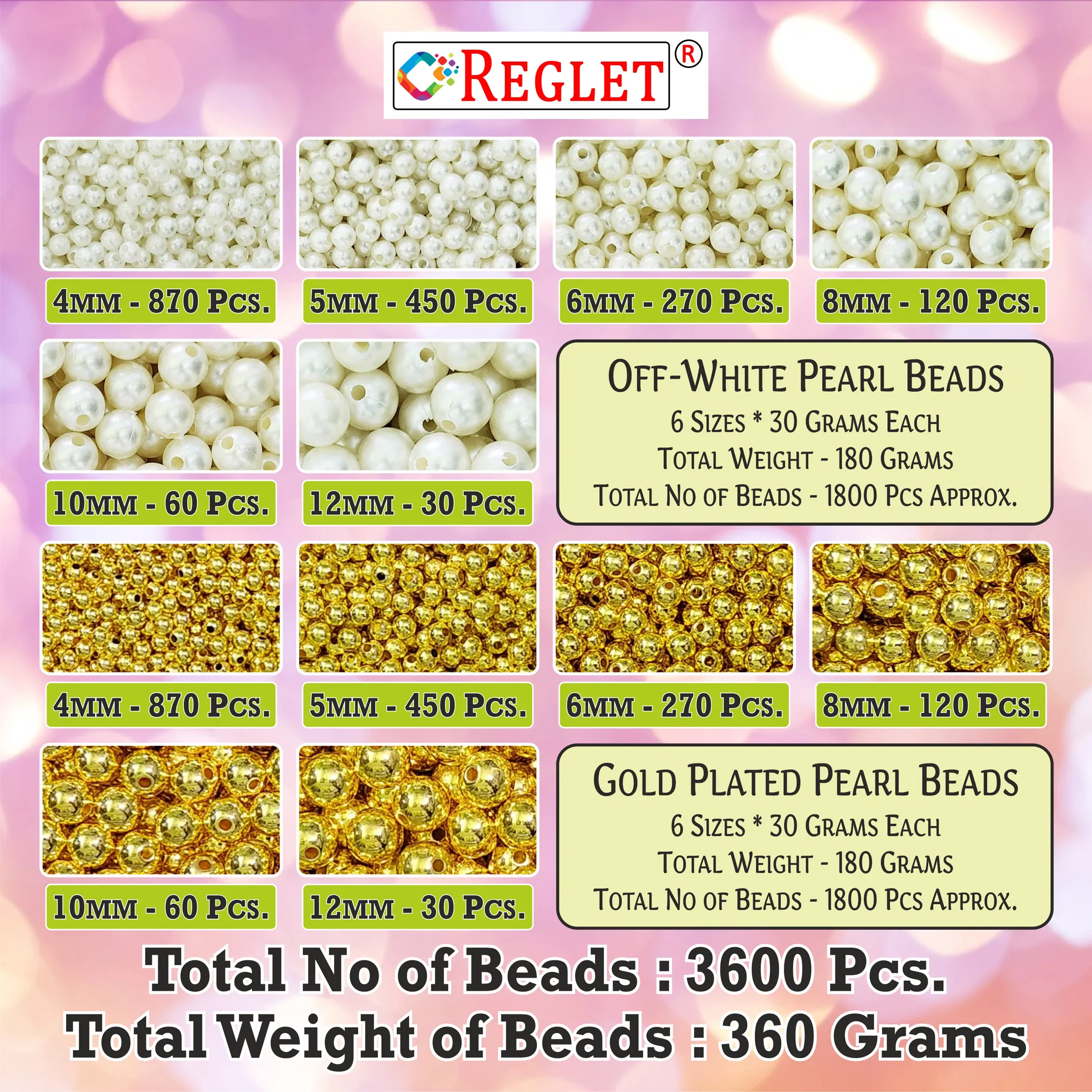 📦 [ PACKAGE INCLUDES ] – The Package includes of 1800 Pcs Gold Plated Round Pearl Beads [Size -4, 5, 6, 8, 10, 12mm] & 1800 Pcs off-White Round Pearl Beads [Size -4, 5, 6, 8, 10, 12mm] & 10 Metres Elastic Wire. Total Weight of Beads – 360 Grams., Total Number of Beads – 3600 Pcs Approx.