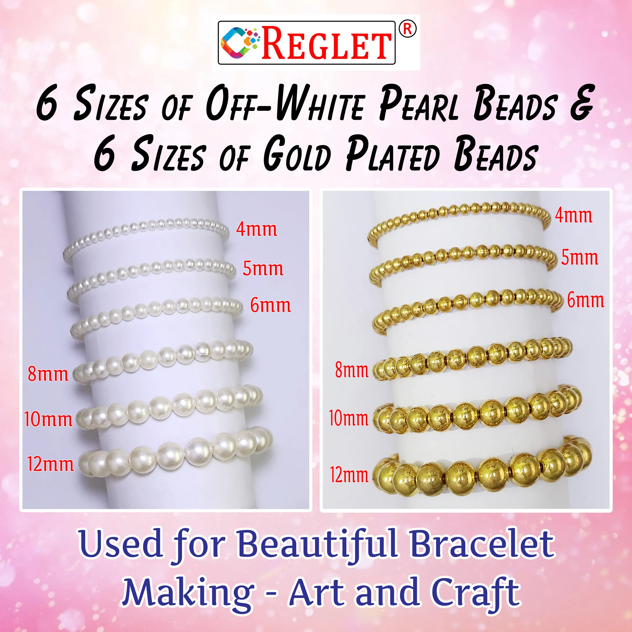 REGLET Combo of 4mm, 5mm, 6mm, 8mm, 10mm, and 12mm Golden and Off-White Artificial Pearl Beads is a stunning mix for jewellery and craft lovers. Perfect for Beads for Jewellery Making Kit, Beadwork, Crafting, and Embroidery, these elegant pearls add a touch of grace and luxury to bracelets, necklaces, and décor items. With their smooth finish and radiant shine, these Pearls for Craft are ideal for both traditional and modern beading projects, offering endless creative possibilities.