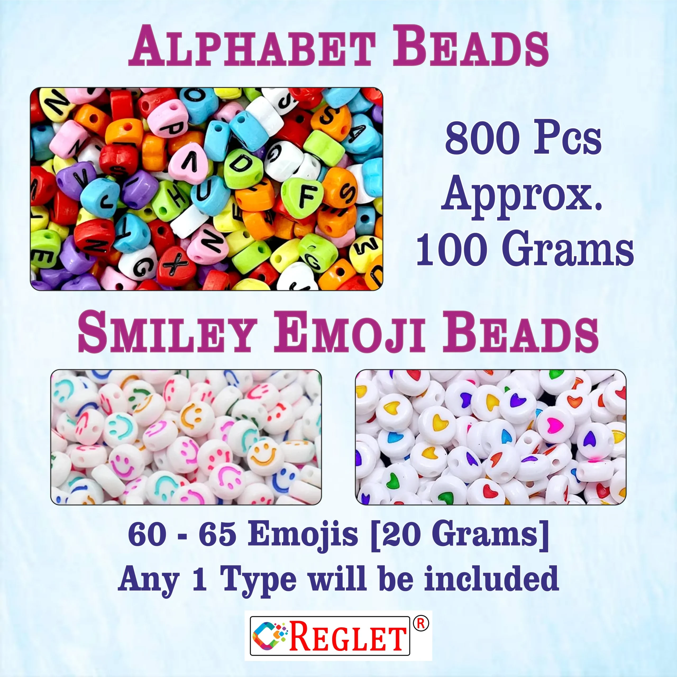 Create fun and personalized jewellery with the REGLET 800 Multicolour Heart Shaped Alphabet Beads + 65 Emoji Beads Kit. Made of durable acrylic, these bright, heart-shaped letter beads and smiley emojis bring charm to any DIY bracelet or craft project. The set includes 5m elastic wire for easy stringing and a total weight of 120g. Perfect for jewellery enthusiasts, kids, and crafters, this kit adds creativity, learning, and joy to your handmade accessories and friendship gifts.