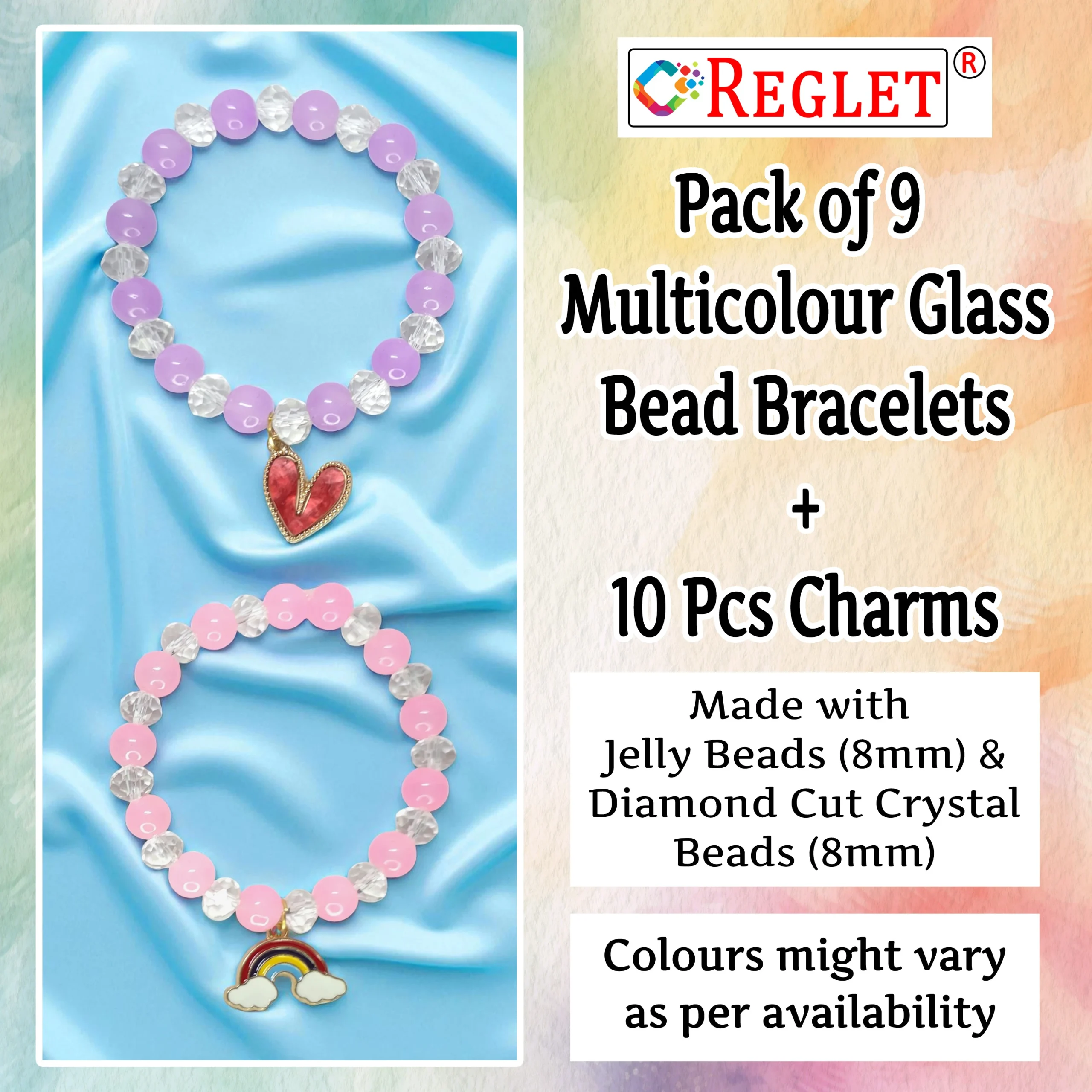 Jelly & Diamond Cut Glass Beads Bracelet Set with Charms – Pack of 9 – Stretchable