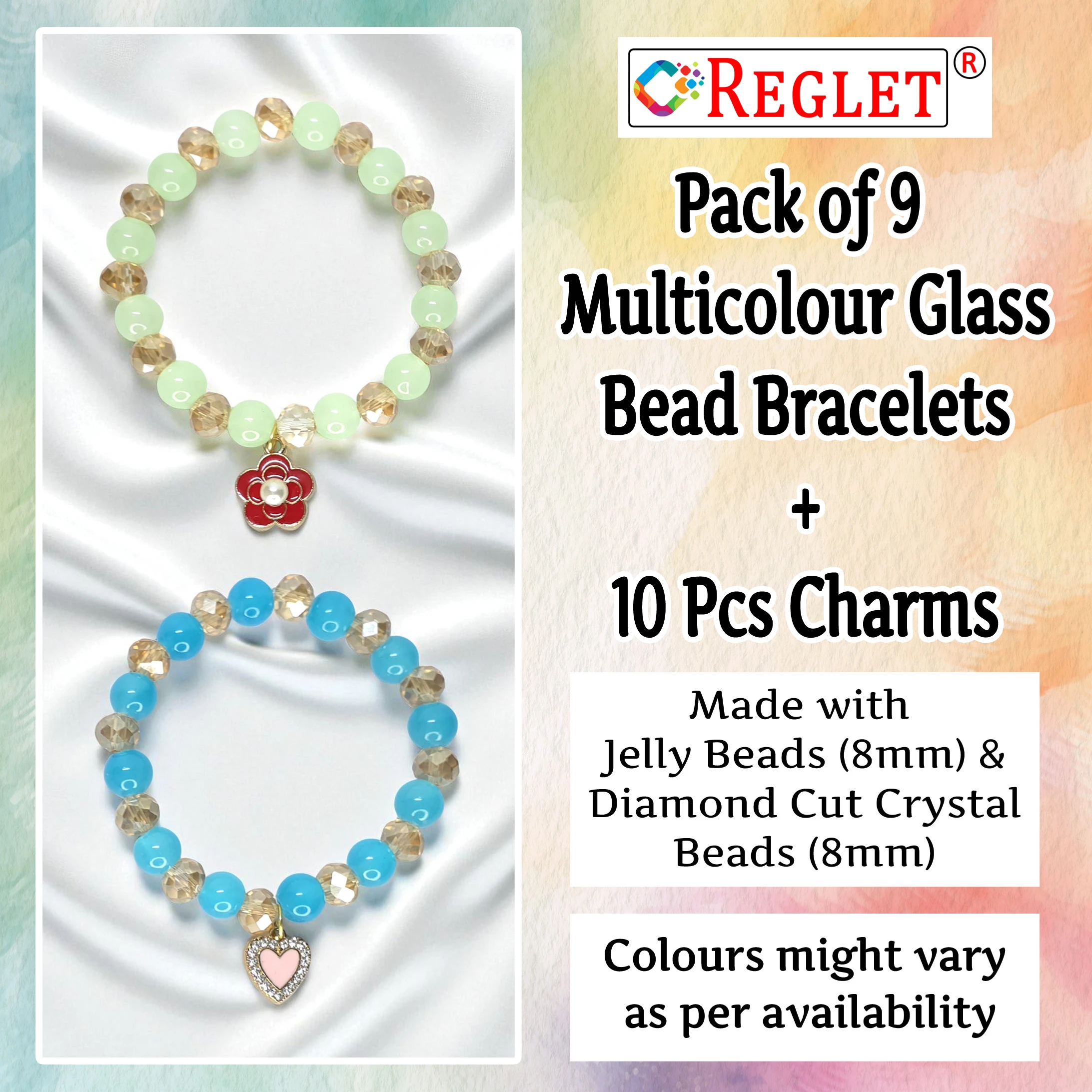 [ PACKAGE INCLUDES ] – This set contains 8 Adjustable Glass Bead Bracelets made of Jelly + Diamond Cut Beads with 10 Pieces Metal Charms. The Size of Glass beads is 8mm. Adjustable size: Pack contains 5 metres elastic cord, allowing you to easily adjust the bracelet to fit your wrist comfortably. Elegant Glass Bracelets with Metal Charms: Beautifully designed using Jelly and diamond cut glass beads combined with delicate metal charms, these bracelets add a touch of sophistication to any look. Versatile Jewellery for Women & Girls: Lightweight and stylish, these bracelets pair perfectly with ethnic wear, western outfits, or party dresses—ideal for daily wear, festivals, and special occasions. Perfect Gifting Option: A thoughtful jewellery gift, these charm glass bracelets are ideal for birthdays, anniversaries, return gifts, or festive celebrations, making every occasion more special.