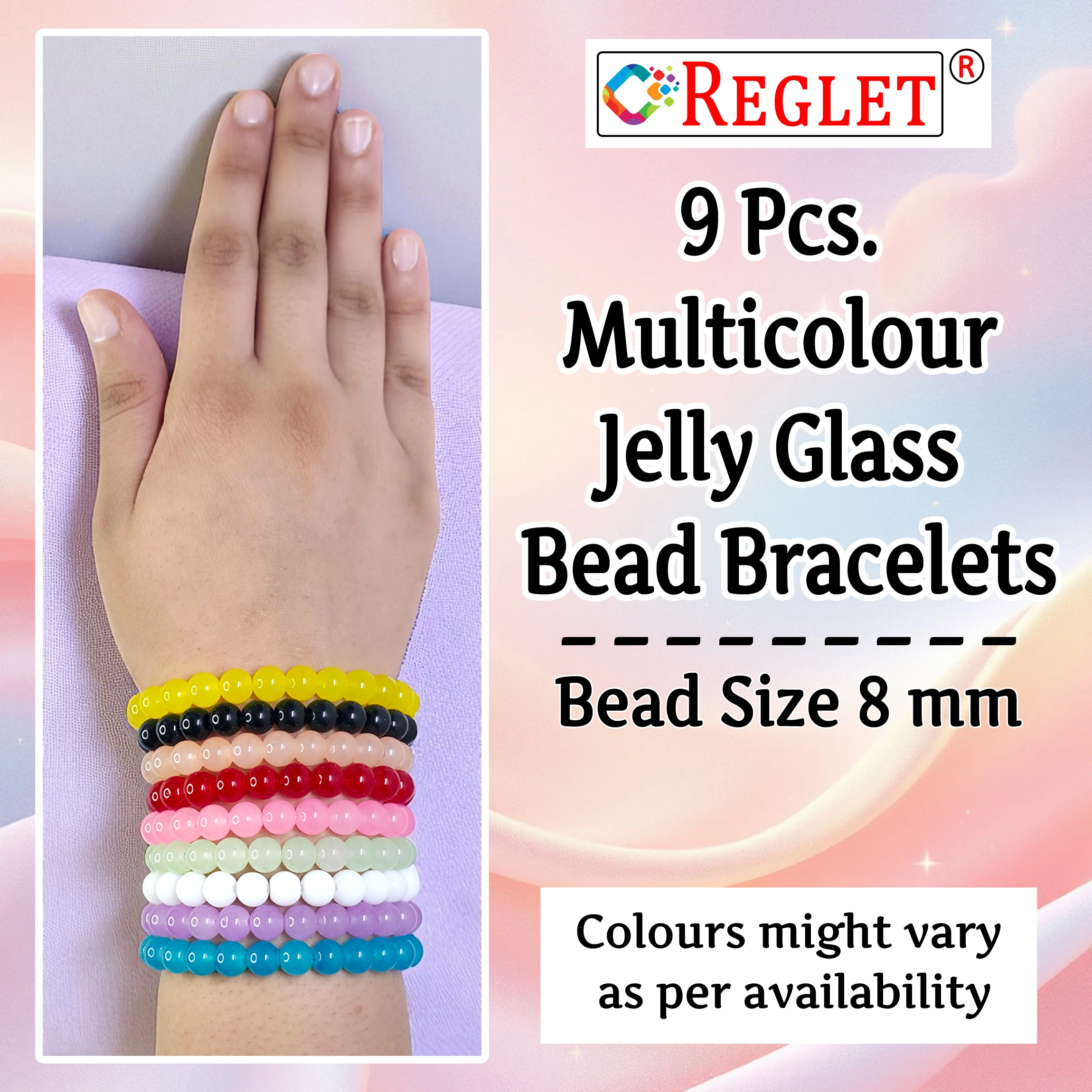 [ PACKAGE INCLUDES ] – This set contains 9 Adjustable Jelly Glass Bead Bracelets. The Size of Glas beads is 8mm. Adjustable size: Pack contains 5 metres elastic cord, allowing you to easily adjust the bracelet to fit your wrist comfortably. Stylish Jelly Glass Bracelets: Crafted with smooth, Jelly-finish glass beads, these bracelets offer a modern and minimalistic look—perfect for daily wear, festive outfits, or casual fashion styling. Ideal for DIY Jewellery and Accessory Sets: These Jelly glass bracelets are a great addition to any jewellery making kit. Wear them as-is or use them for creating custom accessories and handmade gifts. Perfect Gift for Girls and Women: A versatile choice for birthdays, holidays, or everyday gifting. These elegant bracelets can be stacked or worn solo, making them suitable for all ages and fashion styles.