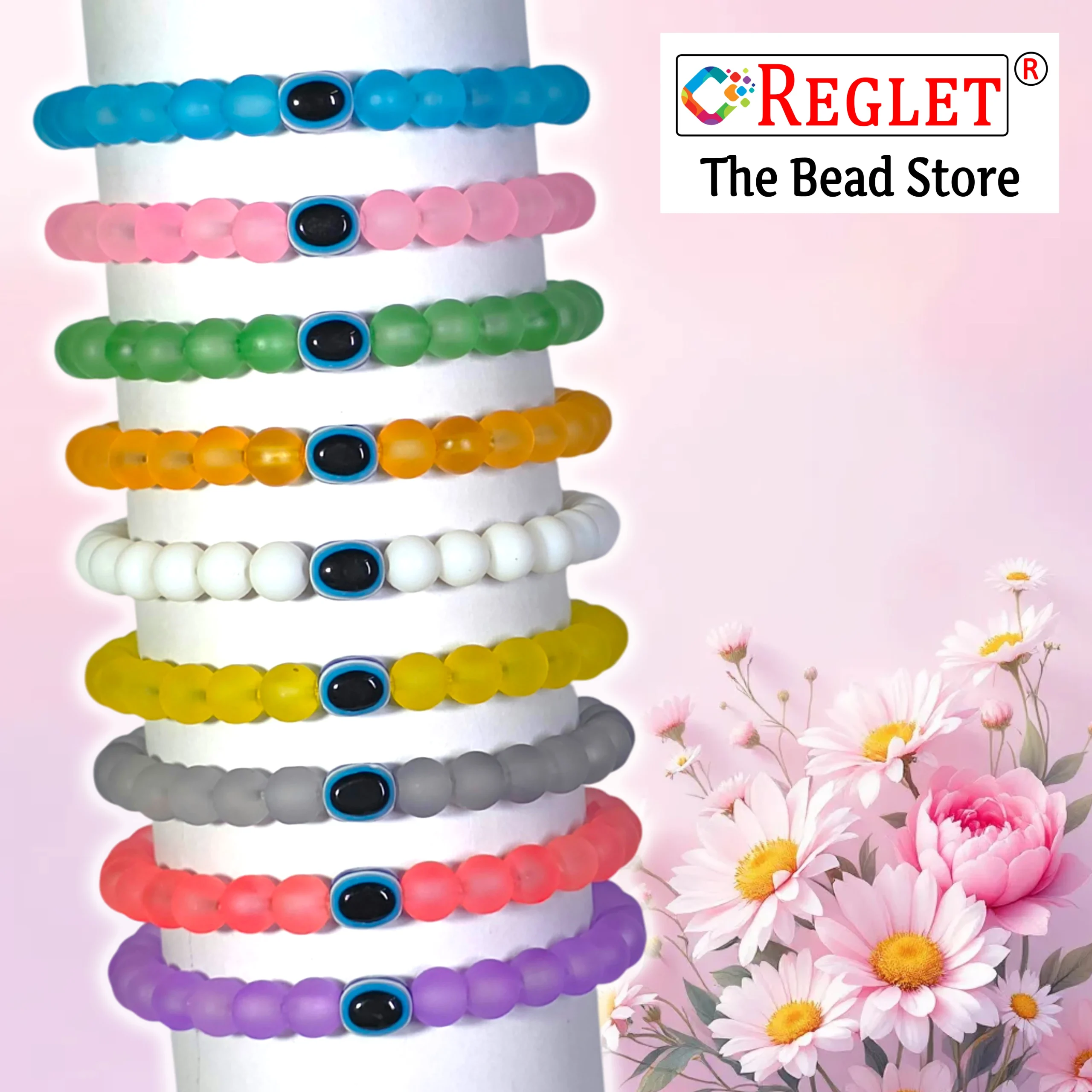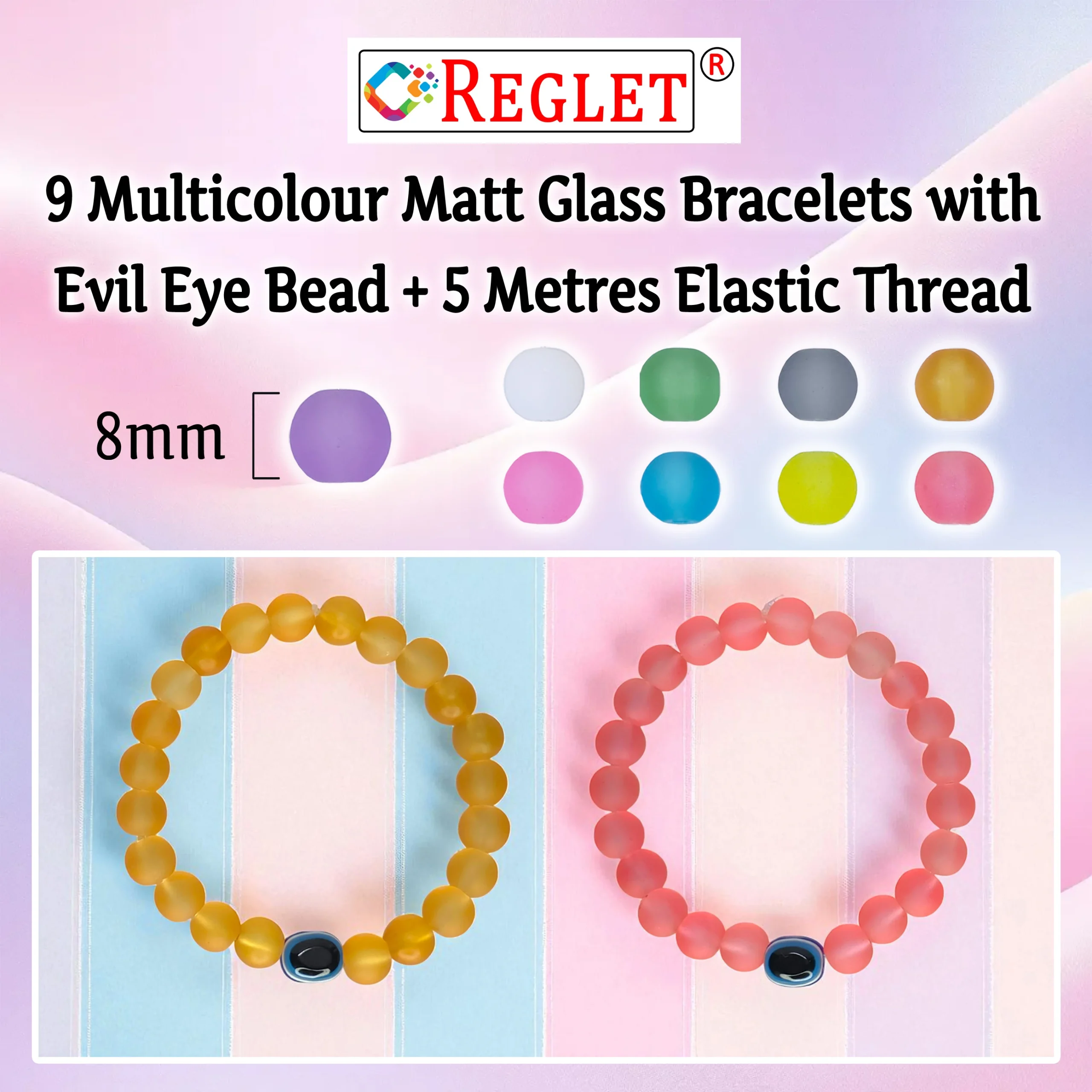 🌈 Multicolour Matt Glass Bracelets with Evil Eye Bead – Pack of 9 stylish 8mm bead bracelets featuring protective evil eye bead, perfect for daily wear and layering.
