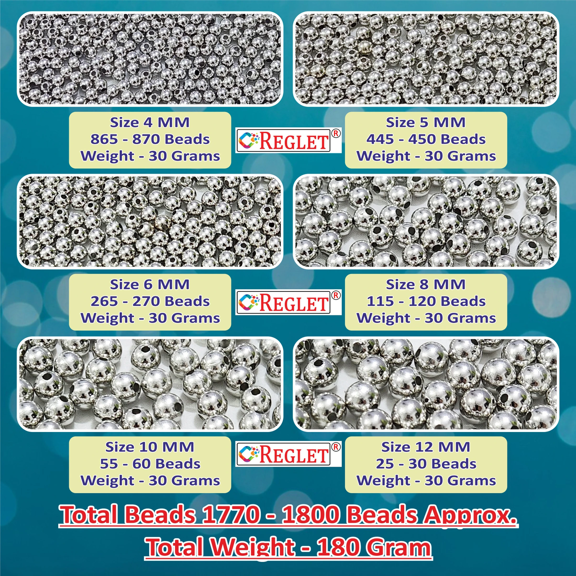 📦 [ PACKAGE INCLUDES ] – The artificial Silver Round Pearl Beads Kit contains 865-870 Pcs. of 4 mm, 445-450 Pcs. of 5 mm, 265-270 Pcs. of 6 mm, 115-120 Pcs. of 8 mm, 55-60 Pcs. of 10 mm, 25-30 Pcs. of 12 mm (Total Beads 1770-1800 Pcs.) and 5 Metres Elastic Thread. Weight of each size of beads will be 30 Gram. Total Weight of all Beads – 180 Gram