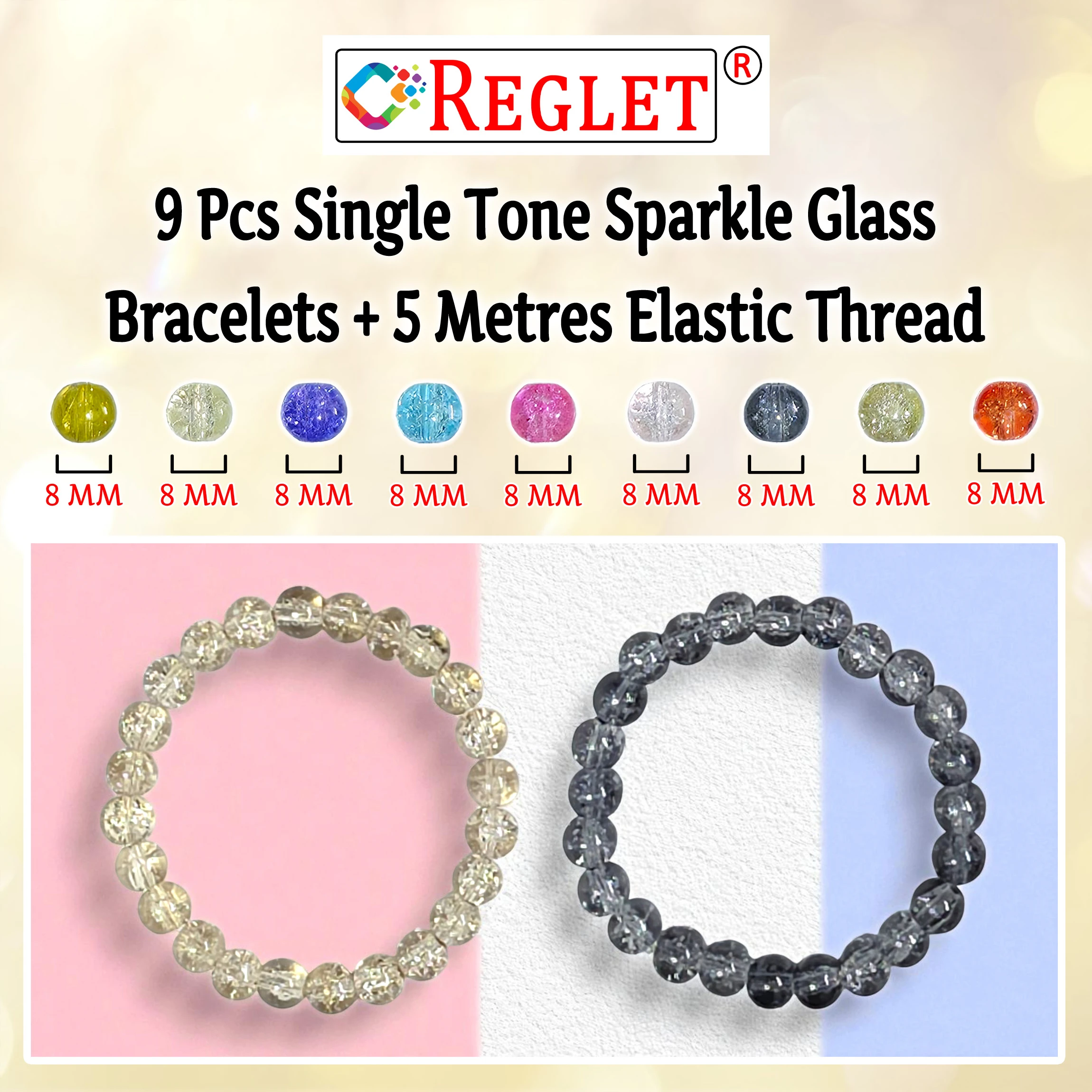 The REGLET Pack of 9 Single Tone Sparkle Glass Bead Bracelets is a perfect combination of elegance, versatility, and comfort. โœจ Each bracelet is carefully designed with 8mm sparkle glass beads in single shades, offering 9 different vibrant colours to match your everyday outfits or festive looks. ๐ŸŽจ The stretchable and adjustable design ensures a comfortable fit for most wrist sizes, making these bracelets both stylish and practical. ๐Ÿ’Ž Whether you want to wear them individually for a minimalist look or stack them together for a trendy layered style, these bracelets are sure to elevate your jewellery collection. ๐Ÿงต This pack also includes 5 metres of durable stretchable wire, giving you the flexibility to create new designs, customise, or repair bracelets as per your preference. ๐ŸŒŸ A thoughtful choice for self-use or gifting, this set is perfect for women and girls of all ages.