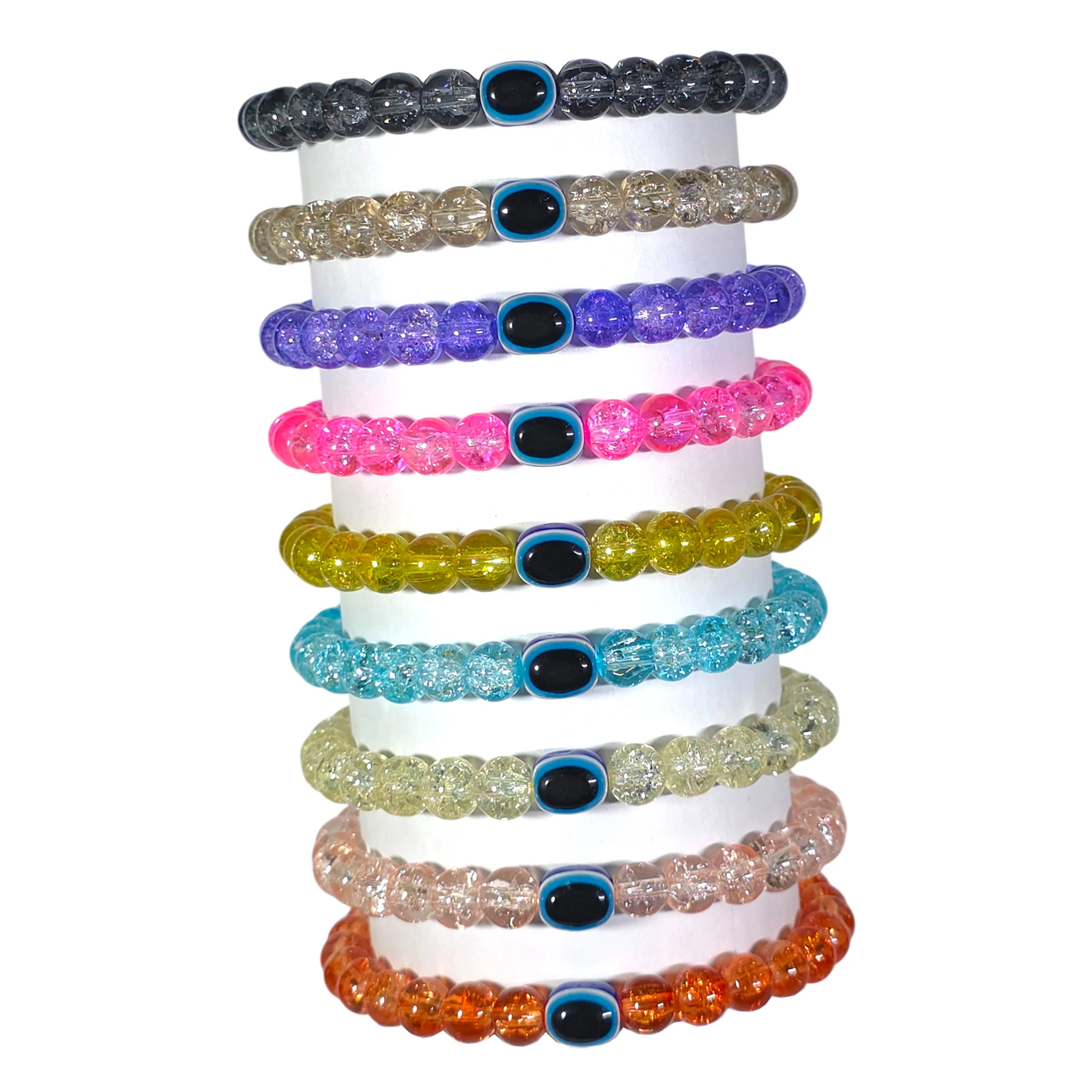 โจ 9 Evil Eye Bracelets in One Pack โ A stylish set of 9 single-tone sparkle glass bead bracelets, each finished with an elegant Evil Eye bead for a unique touch.